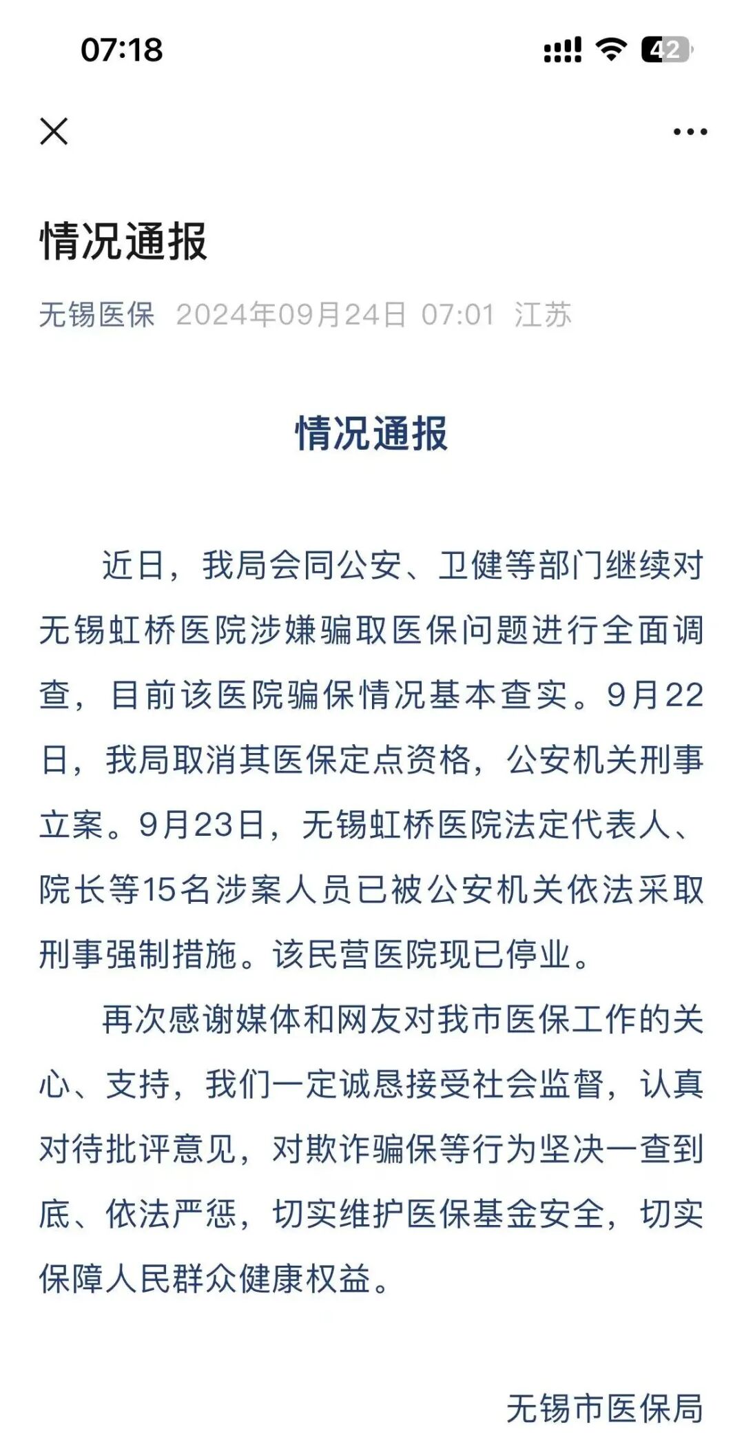 另据央视新闻报道,目前,无锡市医保局根据协议管理规定,已经作出与无锡虹桥医院解除医保服务协议的处理;当地公安机关已立案侦查,医院有关人员已被控制,后续将依法严肃处理。