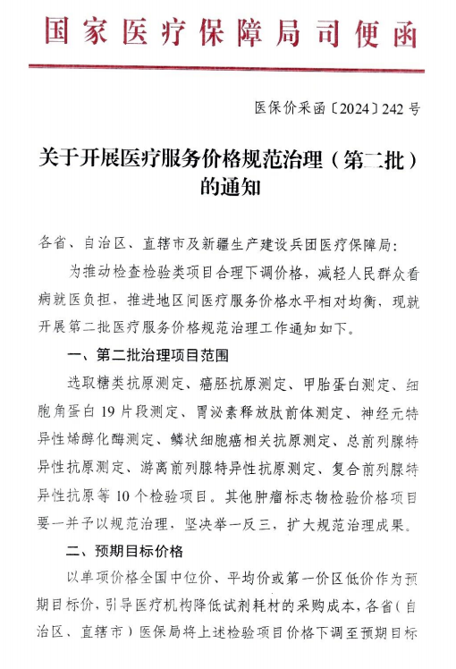 第二批价格治理对象都是肿瘤标志物的检验项目。具体包含了糖类抗原测定、癌胚抗原测定、甲胎蛋白测定等10个检验项目,与安徽省近期牵头的27省集采中肿标项目重合。《通知》要求各地医保局以单项价格全国中位价、平均价或第一价区低价作为预期目标价,将上述检验项目价格下调至预期目标附近,上下浮动不超过10%,并在本年11月30日前发文落实第二批价格规范治理工作。不到一个月时间,国家医保局已经开展两批价格规范通知。地区间价格差异大、采购成本差异大、费用占比高、服务量易诱导的检验检查项目成为重点治理对象。《关于开展医疗服务价格规范治理(第一批)的通知》(全文附文末)公布后,各省陆续下调了包括血栓弹力图试验、糖化血红蛋白测定等4类医疗服务项目的价格,最高降幅达到70%。在第一批的通知中,国家医保局表示,通过大数据筛查发现,部分检查检验类医疗服务的地区间价格差异很大。在第一批治理的4项检测项目中,血栓弹力图试验在贵州的价格为100元,在辽宁则高达360元;糖化血红蛋白测定在云南10元,在甘肃则为88元。而从采购成本来看,同一仪器在不同省份采购价格从每台千余元到数十万元不等,同一试剂在不同省份采购价格从每套五六十元到三百多元不等。由此,国家医保局判断,是虚高成本推高了检查检验价格,有压缩的空间。从调整幅度来看,4个项目的降价幅度非常大,尤其是糖化血红蛋白,部分省份最高降幅达70%。尤为重要的是,《关于开展医疗服务价格规范治理(第二批)的通知》强调,“要密切关注价格规范治理后服务量和总费用的变化,防范同类可替代项目激增,防止设备耗材迭代后以新增项目等形式变相回潮”。在医疗服务价格改革的过程中,检查检验等物耗为主的服务项目价格呈现较大幅度的下调趋势。从我国公立医院高质量发展和医疗服务价格改革的角度看,检验检查等物耗为主的项目费用均属于“调减”范畴。为了控制医疗费用的过快增长和医保基金的不合理使用,我国曾推行“耗占比”“检占比”考核,但“一刀切”的方式一定程度上限制了新技术的应用。2019年1月,国务院办公厅发布《关于加强三级公立医院绩效考核工作的意见》,不再考核“医学检验检查收入占比”。与此同时,DRG/DIP改革成为新的约束条件。在医保支付改革的影响下,检验检查已成为医院的成本项,而伴随带量集中采购的推行,耗材采购成本也在下降。但检验的收入比例仍在增高。根据卫生统计年鉴的数据,2021年我国公立医院检验收入达4093亿元,检验收入占总收入比例由2015年的10.7%提升至2021年的11.6%。今年8月,国家医保局对2023年以来部分定点医疗机构实施“糖化血红蛋白”检测的情况进行筛查和分析。截至目前,各地医保局已追回医保基金近6000万元,约谈定点医疗机构5183家次。面对集采、“价改”导致的医疗收入下降,部分医院可能通过加大检查量或使用同类可替代项目来弥补“单价”的损失。例如,既往的医保飞检和专项检查中发现,部分医院存在以“肿瘤十三项”“肿瘤十项”等组套形式,违规打包收取肿瘤相关抗原类检测费用的情况;再如,冠脉支架集采后,一些医疗机构更倾向于使用价格相对较高的球囊来弥补收入的减少。我国医疗服务价格改革一直遵循的是“有升有降”的原则,对于一些价格长期处于低位,但技术劳务价值高的项目进行调高,例如门急诊诊查、手术、护理、中医等,而不少服务量较大、以物耗为主的检查检验类项目费用,都出现了明显下降。公立医院高质量发展的目标,要求每家医院的医务性收入(诊查+护理+手术治疗)占比达到60%。作为我国医改的前沿阵地,三明今年9月发布的《深化医药卫生体制改革行动方案》提出,到2027年,全市二级及以上公立医院医疗服务收入、药品耗材收入、检查化验收入比基本达到5∶3∶2。据悉,三明市2023年的医务性收入占比已经达到46%。