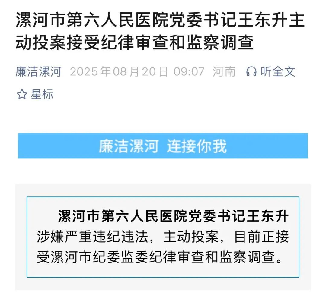 据漯河市纪委监委消息:漯河市第六人民医院党委书记王东升涉嫌严重违纪违法,主动投案,目前正接受漯河市纪委监委纪律审查和监察调查。 王东升履历显示: 历任河南省漯河市郾城区卫健委党组书记、主任。 任漯河市第六人民医院党委书记。 漯河市第六人民医院是集医疗、教学、科研、预防、康复、急救为一体的国家二级甲等综合医院。始建于1946年,前身是武汉铁路局漯河医院,2004年铁路改革后移交地方政府管理,被命名为漯河市第六人民医院,是北京安贞医院、上海远大心胸医院、武汉大学中南医院协作医院,是郑大一附院、河南省人民医院、河南省肿瘤医院、河南省胸科医院医联体医院,是郑州、武汉铁路局医保定点医院和漯河市城镇职工、城乡居民等各级各类医保定点医院,2016年被漯河市政府命名为漯河市心血管病医院。