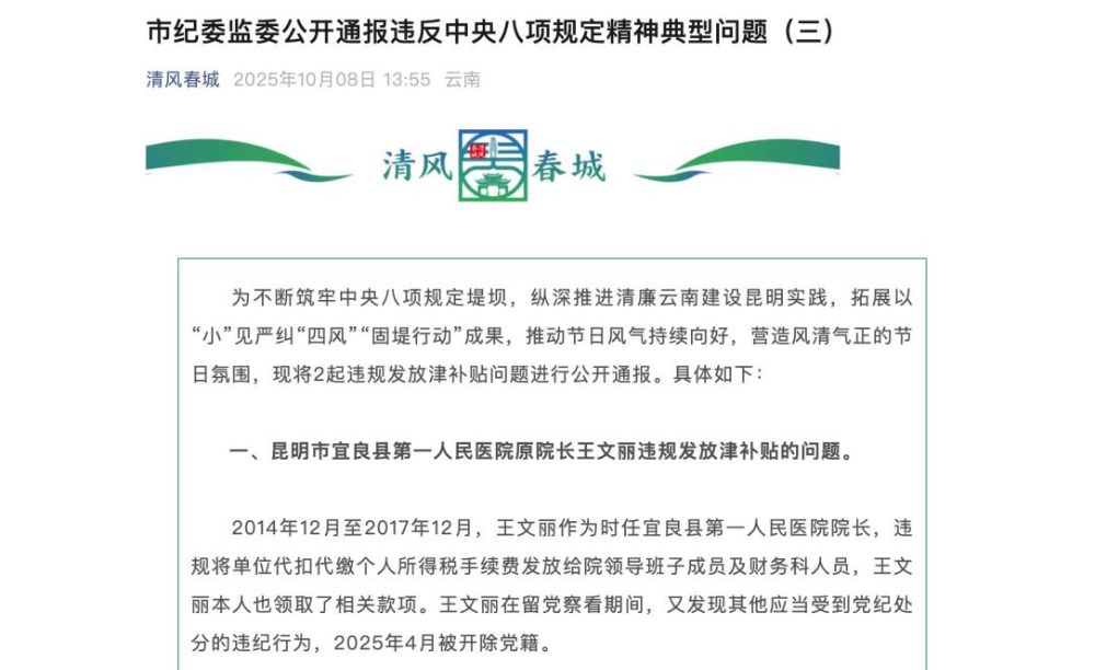 “医学界”综合整理10月8日,昆明市纪委监委官方账号“清风春城”公开通报2起违反中央八项规定精神典型问题,其中包括昆明市宜良县第一人民医院原院长王文丽违规发放津补贴的问题。据通报,2014年12月至2017年12月,王文丽作为时任宜良县第一人民医院院长,违规将单位代扣代缴个人所得税手续费发放给院领导班子成员及财务科人员,王文丽本人也领取了相关款项。王文丽在留党察看期间,又发现其他应当受到党纪处分的违纪行为,2025年4月被开除党籍。官网显示,宜良县第一人民医院始建于1936年,目前是一所集医疗急救、预防保健、技术指导、科研教学为一体的三级综合医院,是昆明学院非直属附属医院。医院核准床位950张,设置23个临床科室、8个医技科室。
