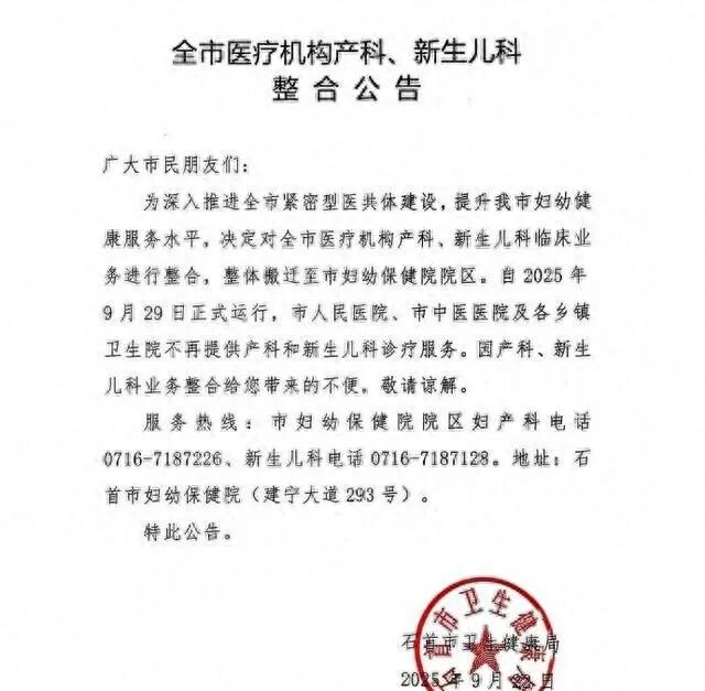 国庆前夕,石首市卫健部门发布公告,为推进紧密型医共体建设、提升妇幼健康服务水平,决定整合全市医疗机构产科与新生儿科临床业务。相关业务将整体搬迁至市妇幼保健院院区,自 2025 年 9 月 29 日起,市人民医院、市中医医院及各乡镇卫生院不再提供这两类诊疗服务。公告同时对整合可能带来的不便向公众致歉。