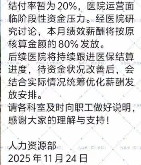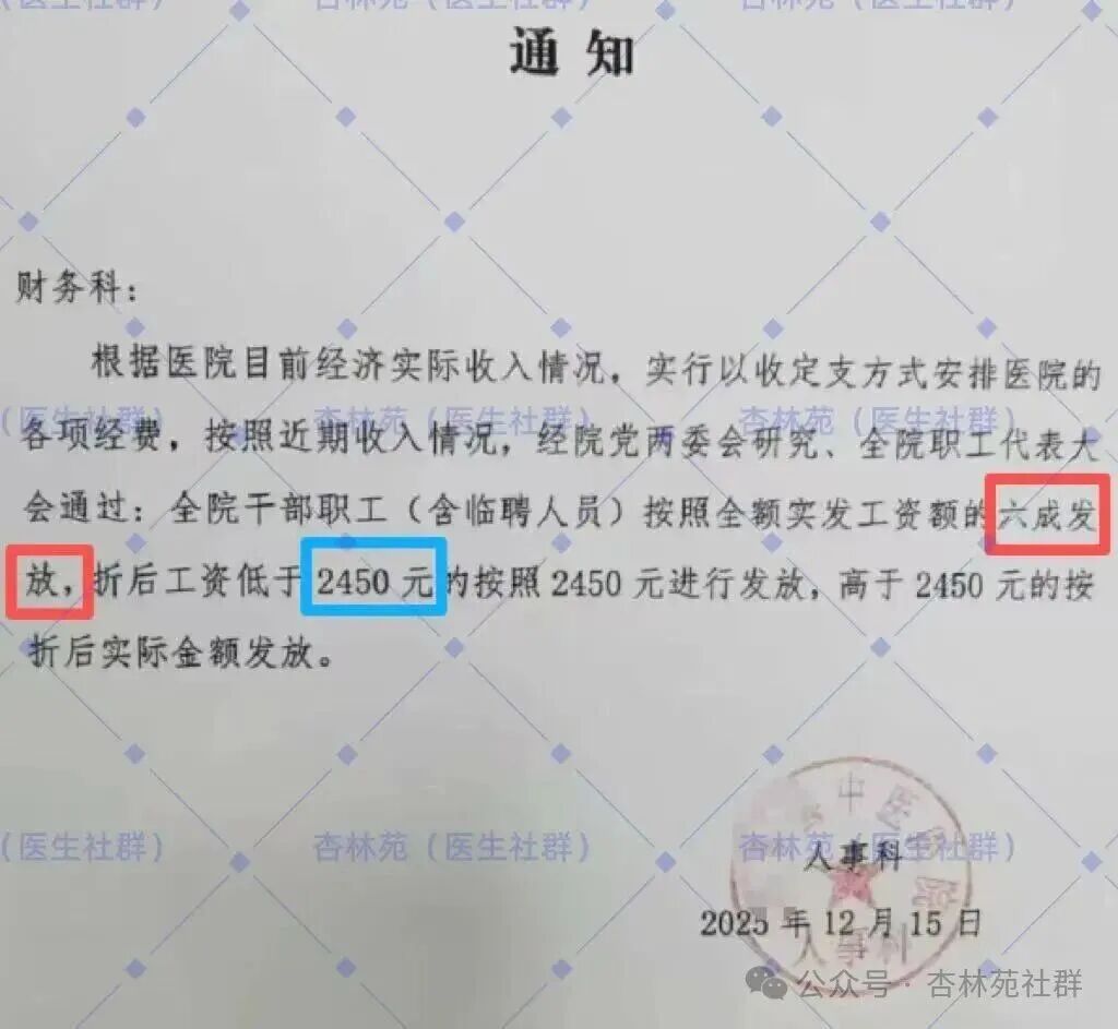 近日,一份某医院人事科的通知在医疗圈广泛流传,引发了医务人员们的思考和热烈讨论。 通知中明确写道:因医院经济实际收入情况,经研究决定,全院干部职工(含临聘人员)按全额实发工资的6成发放,低于2450元的按2450元保底。