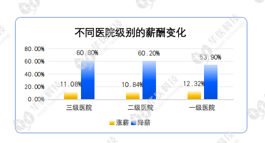 在该报告中,数据显示,二三级医院降薪人员占比超过一级医院,且主要来自于绩效奖金的降低;公立医院降薪人员占比超过民营医院。