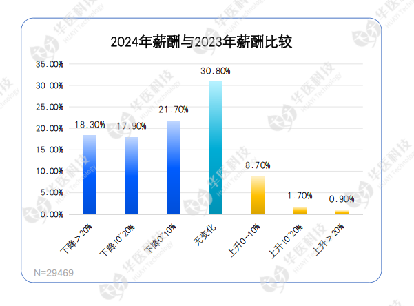 仔细查阅各项数据,我们发现,参与调研的近3万名医务人员2024年薪酬下降的占比高达57.9%,相较去年已发布调研报告中“37%的医务人员薪酬下降”增加了20个百分点,薪酬下降呈扩大趋势。
