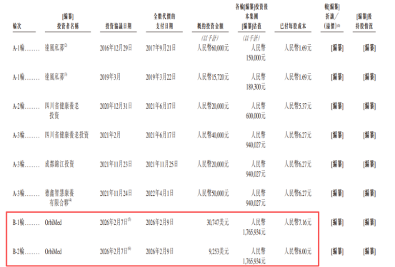 就在递交上市申请前不久,锦欣康养于2026年2月9日完成了B-1轮和B-2轮融资,累计融资金额为4亿美元,投资方为OrbiMed。根据招股书披露,本轮融资后,公司估值达17.66亿元。