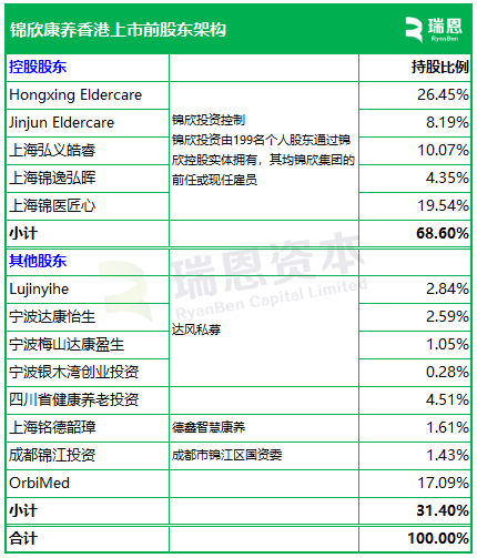 招股书同时披露,公司于上市前由一组控股股东集团共同控制。据“瑞恩资本”整理,在锦欣康养赴港上市前的股权架构中,锦欣投资通过多家实体合计持股68.60%,为公司控股股东。