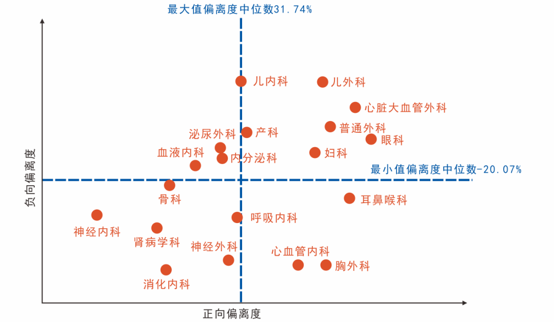 19个专科得分的CV值在0.09~0.19之间、中位数在539.93~671.92之间、偏离度在40.56%~75.37%之间。对19个专科的偏离度进一步分析,见下图。