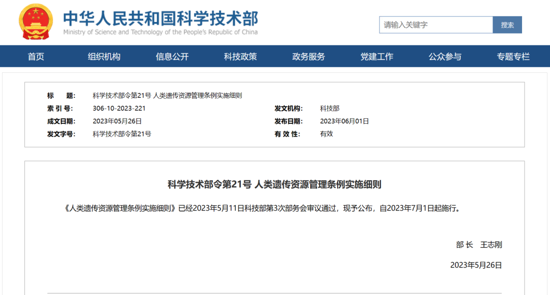 6月1日,科技部发布第21号令《人类遗传资源管理条例实施细则》,对采集、保藏、利用、对外提供我国人类遗传资源进行明确规定,旨在促进人类遗传资源有效保护和合理利用。