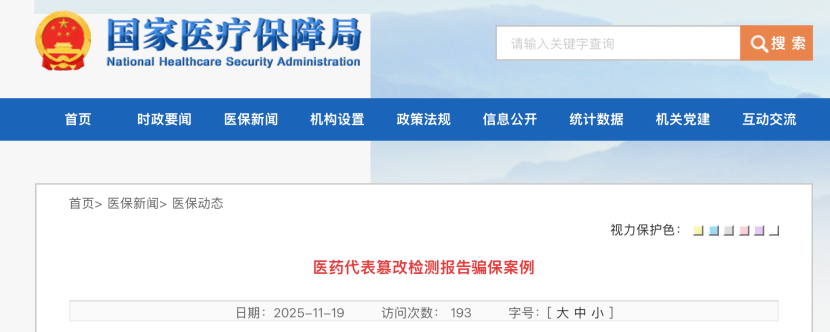 11月19日,国家医保局发布《医药代表篡改检测报告骗保案例》。