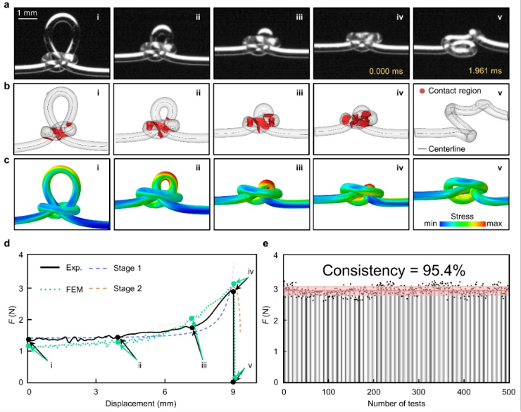 针对外科手术中的“死结”难题,中国专家取得重大突破。北京时间11月27日,浙江大学交叉力学中心杨卫院士团队,联合浙江大学医学院附属邵逸夫医院蔡秀军院士团队,共同在国际顶级期刊《自然》发表论文,创新性地提出了“Sliputure”——活结智能缝线,并成功将其应用于外科缝合。在外科手术中,缝合伤口所打的“外科结”是一个死结,用于闭合组织。这种结一旦打牢,便很难调整。通常而言,结打得过松,伤口可能会开裂,影响组织愈合;结打得太紧,则可能造成局部血供受阻,极易导致组织缺血坏死。长期以来,这种“松紧程度”很大程度上依赖于主刀医生的手术经验,但由于力度缺乏量化标准,存在多个不确定性。一方面,年轻医生的操作可能不稳定,另一方面,对于使用手术机器人的手术,机械臂下手也“不太有轻重”。为此,杨卫院士、蔡秀军院士团队提出了一个令人意想不到的解决思路——利用“滑结”(slipknot)来编码与传递力。通俗来说,这一方法是在死结旁边预先打个活结,当在打死结、拉紧缝合线,导致活结解开的同时,就预示着死结打结完毕。要实现这一过程,浙江大学航空航天学院交叉力学中心教授李铁风阐述原理称,首先,做活结过程中要把精准的峰值力信息存在结中;其次,解开活结过程,可将力的信息传递给串联的系统中;最后,力学模型刻画信息和力的传递,一并接入机器人或人的操纵系统,完成死结。其中最大的技术难点之一在于,由于打死结的力是由活结解开瞬间的力决定,因此活结必须稳定可控且保持力的一致性。也就是说,要确保每一个活结都能在预设的、唯一的、精准的力度下打开。为此,联合团队开展了一系列技术攻关,由多名来自力学、医学、数学、材料、机械、控制等多个不同学科的老师和同学进行了跨学科交叉合作。团队通过高速摄像机和Micro-CT,捕捉到活结细微的滑动轨迹。随后通过力学建模、有限元仿真等手段发现了活结蕴藏的有序规律——解开活结的力,与编紧活结时拉紧结点的力(预紧力)、结环数量、直径、摩擦系数、模量相关。因此仅需要改变上述参数,即可获得对应打开力的活结。实验显示,针对特定的活结,解开它们最后那一瞬间的力(峰值力)是高度一致的。此后,研究团队反复改进,历经大量设计迭代,通过测试、采集不同年资外科医生的打结数据以及不同材料、式样活结的力学指标,并利用计算机建模,预制了大量的活结,最终完成了一套“基于活结的力学传导机制”程序。团队制造出来几百根特制缝线——它们各自带有一个不同结法的活结,解开它们的力也各不相同,实现了不同手术场景下“活结”对“死结”的准确调控。研究显示,在动物肠道修复手术实验中,该系统使得吻合肠道既不渗漏,又不撕裂。从开放大鼠肠道修复,到腹腔镜下活体猪肠道修复,再到机器人的操作,都获得了很好效果。目前,应用这项技术的内镜和手术机器人,可以使相对缺乏经验的外科医生在缝合打结力的精确度上提升121%,接近甚至媲美经验丰富的外科医生。同时,它还能赋能手术机器人,在无力传感器的情况下实现实时、可靠的力控制。蔡秀军院士是我国微创外科与智能医学领域的开拓者之一,曾获第四届医学界价值医疗泰山奖—医疗创新奖。他亲身见证并推动着外科手术从大开大合到精准微创的迭代,也深刻感受到当前外科医生在手术台上陷入的“力盲”困境。“技术在进步,但外科医生的手感却在不断消失。”蔡秀军院士表示,传统开放手术中,医生的双手能直接感知组织软硬,精准掌控缝合力度,但代价是患者创伤大、恢复慢;而在微创手术中,这种直接的力反馈大大减弱,又使得打结力度的控制非常依赖医生的个人经验。此次研发的“活结力学传导机制”,虽然提供的解决方案原理看似原始,但却是研究者们对其结构蕴含本质规律的泛化应用,不需要通过传感等电子设备才能做即时判断,避免了手术操作或机器人在缺电或者断网环境中,无法精准工作的问题。展望未来,除了运用于临床,这种不依赖复杂电子器件构建操作的方法原理,还能满足常规手术中的深腔环境,并有望在其他极端条件(深海、深空、深地等特种作业)和极限尺寸研究(极微观系统构造或调控)中展现应用前景。而这也正是浙江大学“医工交叉、临床驱动”创新生态的生动缩影。“Sliputure”的成功,验证了交叉力学研究中的“数智力学”和“Mechano-Intelligence”范式。据了解,目前,研究团队正在构建针对不同组织的力值数据库,致力于开发适用于各类机器人手术及消化道、心血管、神经外科等高精度缝合领域的系列产品。参考文献: