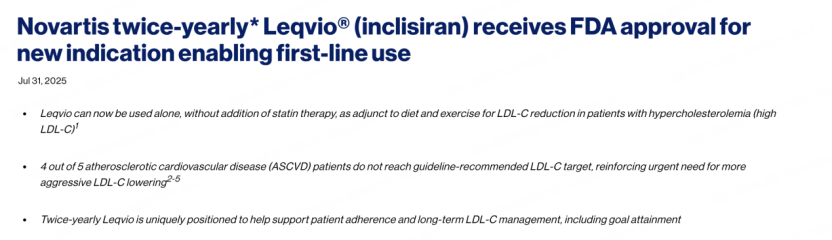 2025年7月31日,美国食品药品监督管理局(FDA)批准长效降脂疗法英克司兰(Inclisiran)的适应证拓展,无需联用其他药物,每年注射两针,即可用于降低高脂血症患者的血脂水平。