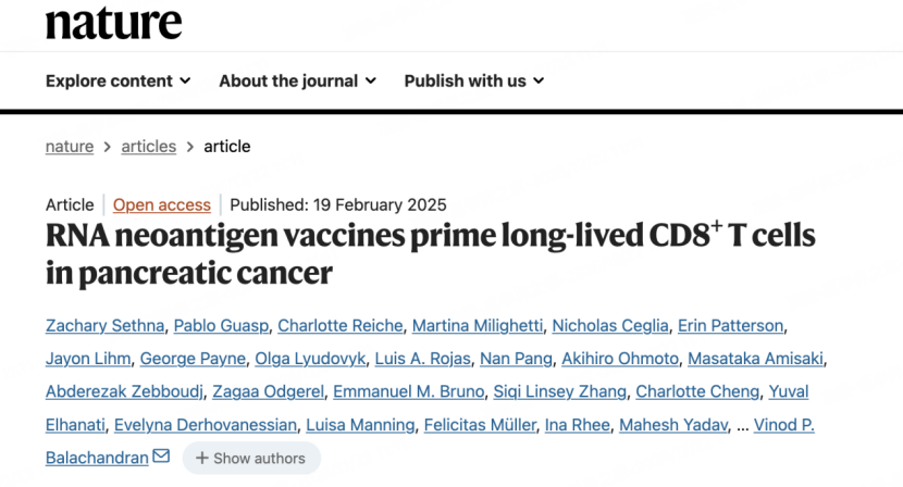 2025年2月19日,《自然》发文,在经手术切除的胰腺导管腺癌(PDAC)患者中,个体化mRNA肿瘤疫苗BNT122持续降低了肿瘤复发风险。