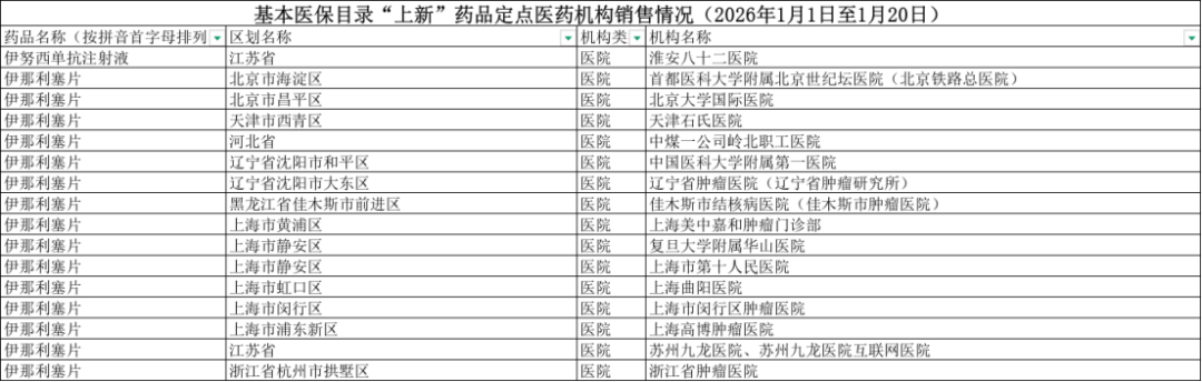 基本医保目录“上新”药品定点医药机构销售情况(2026年1月1日至1月20日)