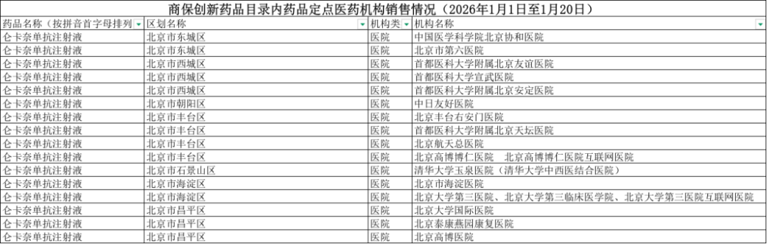 商保创新药品目录内药品定点医药机构销售情况(2026年1月1日至1月20日)