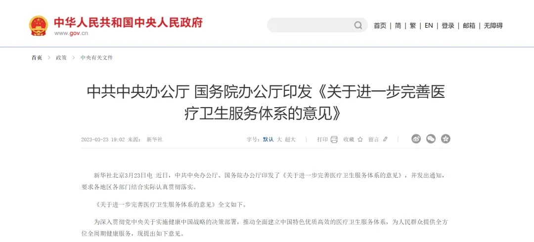 《关于进一步完善医疗卫生服务体系的意见》全文如下:为深入贯彻党中央关于实施健康中国战略的决策部署,推动全面建立中国特色优质高效的医疗卫生服务体系,为人民群众提供全方位全周期健康服务,现提出如下意见。(一)指导思想。以习近平新时代中国特色社会主义思想为指导,深入贯彻党的二十大精神,把保障人民健康放在优先发展的战略位置,贯彻新时代党的卫生与健康工作方针,总结新冠疫情防控经验,坚持以人民健康为中心,坚持预防为主,坚持医疗卫生事业公益性,推动医疗卫生发展方式转向更加注重内涵式发展、服务模式转向更加注重系统连续、管理手段转向更加注重科学化治理,促进优质医疗资源扩容和区域均衡布局,建设中国特色优质高效的医疗卫生服务体系,不断增强人民群众获得感、幸福感、安全感。(二)工作目标。到2025年,医疗卫生服务体系进一步健全,资源配置和服务均衡性逐步提高,重大疾病防控、救治和应急处置能力明显增强,中西医发展更加协调,有序就医和诊疗体系建设取得积极成效。到2035年,形成与基本实现社会主义现代化相适应,体系完整、分工明确、功能互补、连续协同、运行高效、富有韧性的整合型医疗卫生服务体系,医疗卫生服务公平性、可及性和优质服务供给能力明显增强,促进人民群众健康水平显著提升。二、优化资源配置,加强人才队伍建设,推进能力现代化(一)提升卫生健康人才能力。发展壮大医疗卫生队伍,把工作重点放在农村和社区。加大基层、边远地区和紧缺专业人才培养扶持力度,缩小城乡、地区、专业之间人才配置差距。推进农村卫生人才定向培养,落实执业医师服务基层制度,鼓励医师到基层、边远地区、医疗资源稀缺地区和其他有需求的医疗机构多点执业。激励乡村医生参加学历教育、考取执业(助理)医师资格,推进助理全科医生培训。加强公共卫生、全科、儿科、重症医学、呼吸、精神科、传染病、老年医学等领域急需紧缺专业人才培养培训,完善公共卫生与临床医学复合型人才培养机制。继续加强全科专业住院医师规范化培训,实施全科医生转岗培训,扩大全科医生队伍。加强医教协同,落实毕业后教育和继续教育,完善住院医师规范化培训制度。实施医学高层次人才计划,培养一批领军人才。实施中医药特色人才培养工程。(二)提高公共卫生服务能力。健全公共卫生体系,加强专业公共卫生机构和医院、基层医疗卫生机构的公共卫生科室标准化建设。完善各类专业公共卫生机构人员配备标准,加强疾病预防控制能力和队伍建设。构建资源联动、统一质控、信息共享的公共卫生实验室检测网络,提升检验检测能力。健全监测预警体系,提高重大疫情早发现能力。加强重大疫情防控救治体系和应急能力建设,建立健全分级、分层、分流的重大疫情救治机制。完善公共卫生应急管理体系,分级分类组建公共卫生应急队伍。制定医疗卫生机构公共卫生责任清单,明确各类医疗机构公共卫生人员岗位职责和配备要求,并纳入绩效考核内容。健全公共卫生医师制度,探索赋予公共卫生医师处方权。探索建立基层军医到地方急救机构执业培训机制。(三)强化城乡基层医疗卫生服务网底。加强乡镇卫生院和社区卫生服务中心规范化建设,发展社区医院,健全临床科室设置和设备配备。强化常见病多发病诊治、公共卫生、健康管理和中医药服务能力,提升传染病筛查、防治水平,加强重大慢性病健康管理,开展居民心理健康指导,增强乡镇卫生院二级及以下常规手术等医疗服务能力。根据人口分布情况,优化设置社区卫生服务站和村卫生室,建设中心村卫生室,对人口较少的村可通过巡回医疗、邻(联)村延伸服务、上级医疗卫生机构驻村服务等方式,方便群众看病就医。创新乡村医疗卫生人才使用机制,加强县域医疗卫生人才一体化配备和管理,有条件的地方可通过县管乡用和乡聘村用等方式,提高乡村医疗卫生岗位吸引力。(四)突出县级医院县域龙头地位。加强县级医院(含中医医院,下同)临床专科和管理能力建设,强化县级医院公共卫生服务职能。发展急诊科、妇产科、儿科、重症医学科、中医科、精神科、老年医学科、康复医学科、感染性疾病科等学科,提升肿瘤、心脑血管疾病等重大疾病诊疗能力,鼓励依托现有资源建立相关专科专病中心。统筹推进医疗人才组团式帮扶国家乡村振兴重点帮扶县医院工作。通过多种方式加强三级公立医院对口支援县级医院建设。(五)推进医学医疗中心建设。依托高水平医院布局国家医学中心,按规划开展国家和省级区域医疗中心建设,提高医疗服务和重大传染病救治能力,带动全国和区域整体医疗服务水平提升。支持高水平医院建设疑难复杂专病及罕见病临床诊疗中心、人才培养基地和医学科技创新与转化平台,以满足重大疾病临床需求为导向加强临床专科建设,组建专科联盟和远程医疗协作网。鼓励各地在重大健康问题、重点临床学科、紧缺专业、健康产业发展等领域支持建设优秀创新团队。(六)扩大康复和护理等接续性服务供给。通过支持医疗资源丰富的地区将部分公立医疗机构转型为护理院和康复医院、支持社会力量举办等方式,增加康复、护理等专科医疗机构数量,完善接续性服务体系,扩大康复医疗、老年护理、残疾人护理、母婴护理、社区