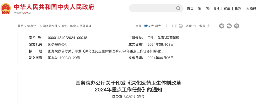 《深化医药卫生体制改革2024年重点工作任务》已经国务院同意,现印发给你们,请结合实际,认真组织实施。
