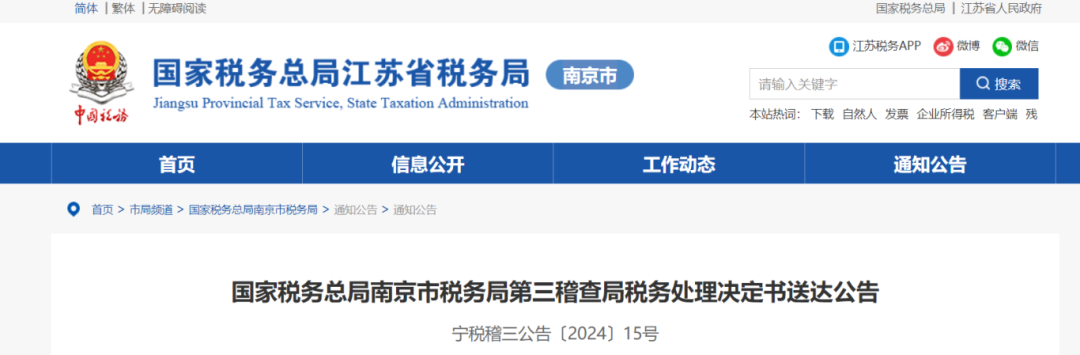 6月19日,国家税务总局南京市税务局第三稽查局税务处理决定书送达公告,23家企业被通报。