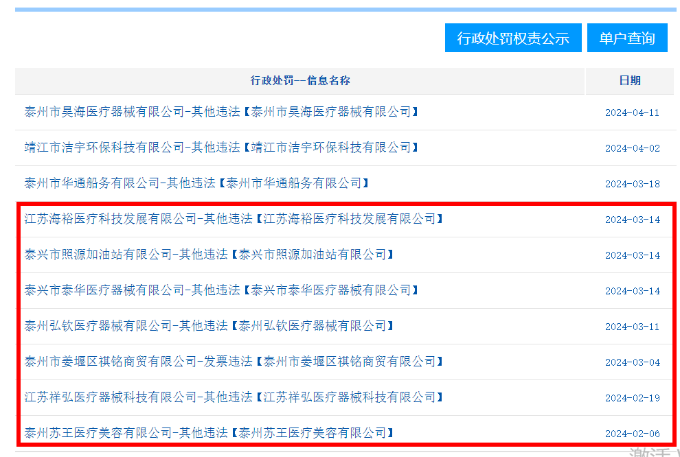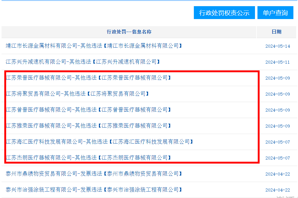 据公告,类似被处罚的械企还有:江苏荣普医疗器械有限公司、江苏曾普医疗器械有限公司、江苏雅荣医疗器械有限公司、江苏海汇医疗科技发展有限公司、江苏雅荣医疗器械有限公司、江苏杰朗医疗器械有限公司、泰兴市泰华医疗器械有限公司、泰州弘钦医疗器械有限公司...等15家械企。