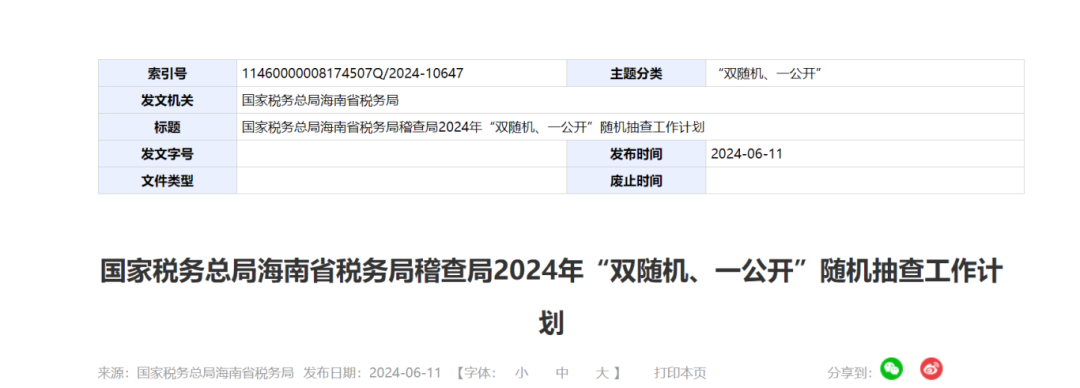 6月11日,国家税务总局海南省税务局发布了《国家税务总局海南省税务局稽查局2024年“双随机、一公开”随机抽查工作计划》,计划于2024年6月11日至2024年12月31日期间,开展随机抽查工作。