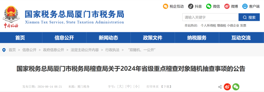 6月14日,国家税务总局厦门市税务局稽查局发布了《国家税务总局厦门市税务局稽查局关于2024年省级重点稽查对象随机抽查事项的公告》,明确本次随机抽查共抽选150户省级重点稽查对象开展随机抽查,抽查年度为2021至2023年度。