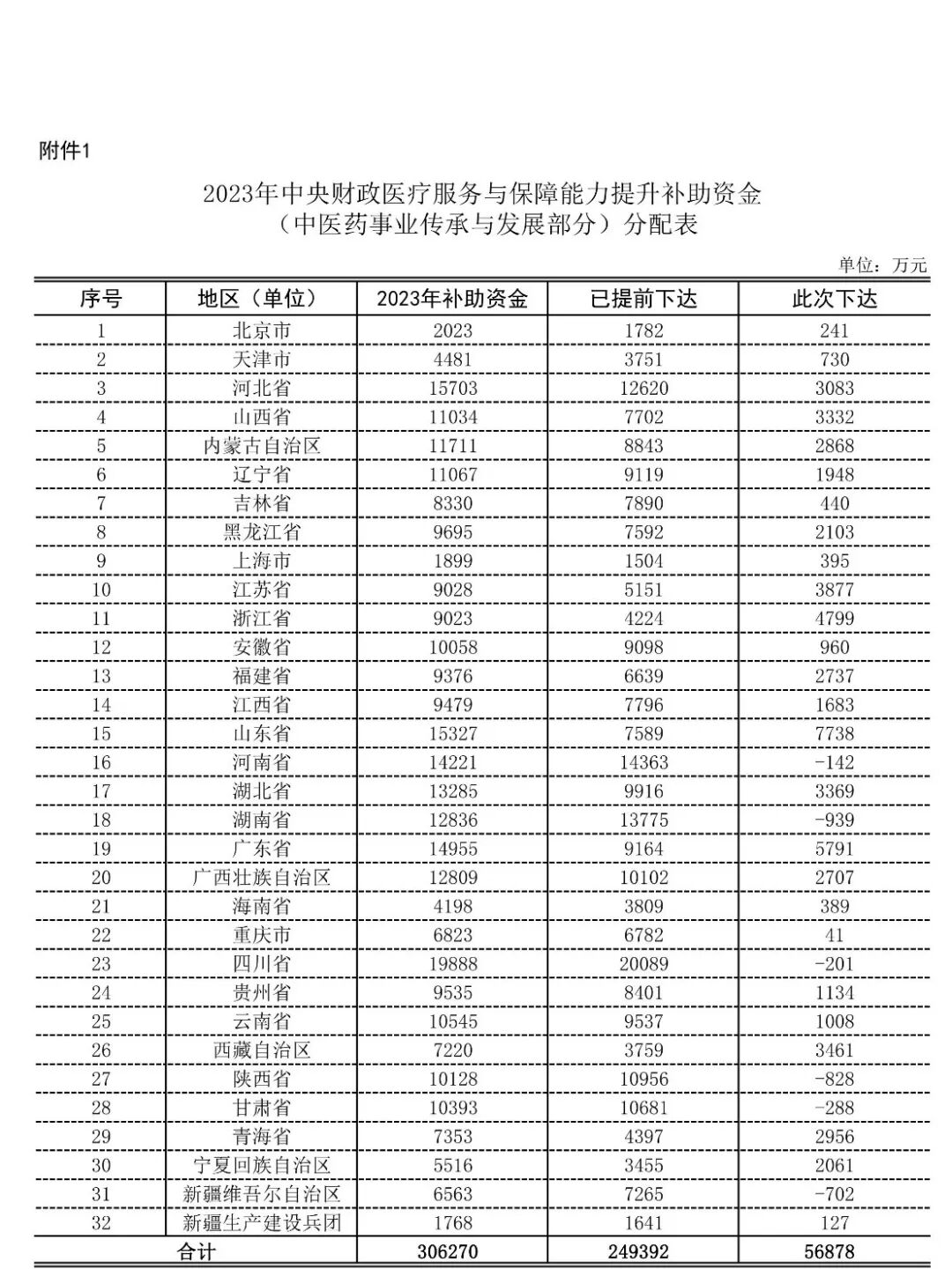 财社〔2023〕29号 各省、自治区、直辖市财政厅(局)、中医药主管部门,新疆生产建设兵团财政局、卫生健康委: 按照《国务院办公厅关于印发医疗卫生领域中央与地方财政事权和支出责任划分改革方案的通知》(国办发〔2018〕67号)有关要求,根据《财政部 国家卫生健康委 国家医保局 国家中医药局 国家疾控局关于修订基本公共卫生服务等5项补助资金管理办法的通知》(财社〔2022〕31号)中《医疗服务与保障能力提升补助资金管理办法》有关规定,经研究,现下达你省(自治区、直辖市、新疆生产建设兵团,以下统称省)2023年医疗服务与保障能力提升补助资金(中医药事业传承与发展部分,项目代码:10000015Z155080000004,见附件1)预算指标,用于支持你省中医药事业传承创新发展。现将有关事项通知如下: 一、该项收入请列入2023年政府收支分类科目“1100249医疗卫生共同财政事权转移支付收入”,支出列“210卫生健康支出”中医药有关支出科目。 二、此次下达的补助资金列入直达资金管理,直达资金标识贯穿资金分配、拨付、使用等整个环节,财政部对直达资金实行动态监控。省级财政部门应在接到中央直达资金指标发文后21日内制定直达资金分配方案,并向财政部备案。 三、你省在下达该项转移支付时,可单独下达预算指标文件,或在预算指标文件中与非直达资金预算指标分别列示,在预算管理一体化系统中分别下达,并保持中央直达资金标识不变。财政部门将中央直达资金分解落实到单位和具体项目时,对资金来源既包含中央直达资金又包含地方对应安排资金的,应在预算指标文件、信息管理系统中按资金明细来源分别列示和登录预算指标。 四、为提高资金使用效益,地方各级财政部门要会同中医药主管部门结合本地实际,统筹安排并使用好中央财政补助资金和地方财政补助资金,促进中医药服务能力提升,切实加强资金管理,提高资金使用效益。 五、为进一步加强预算绩效管理,切实提高财政资金使用效益,请在组织预算执行中对照你省区域绩效目标(见附件2)做好绩效监控,确保年度绩效目标如期实现。同时,请将你省绩效目标及时对下分解,做好本地区预算绩效管理工作。各市县确定的绩效目标经同级财政部门审核后,报省级财政及中医药主管部门备案,并抄送财政部当地监管局。你省中医药主管部门负责对本地区绩效目标完成情况进行考核,国家中医药局会同财政部对考核结果进行检查。考核结果与中央财政补助资金安排挂钩。 附件: 1. 2023年中央财政医疗服务与保障能力提升补助资金(中医药事业传承与发展部分)分配表 2.医疗服务与保障能力提升补助资金(中医药事业传承与发展部分)区域绩效目标表(分发地方) 财政部 国家中医药局 2023年4月11日