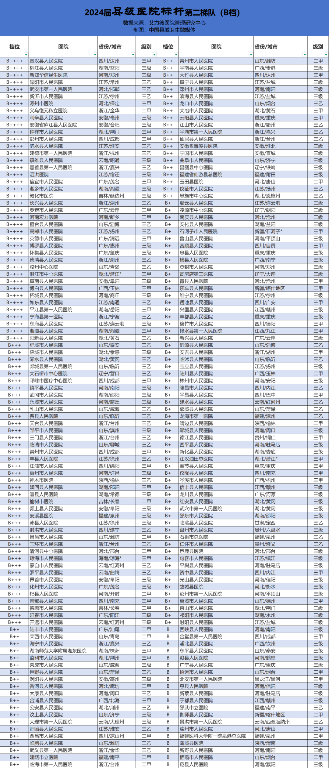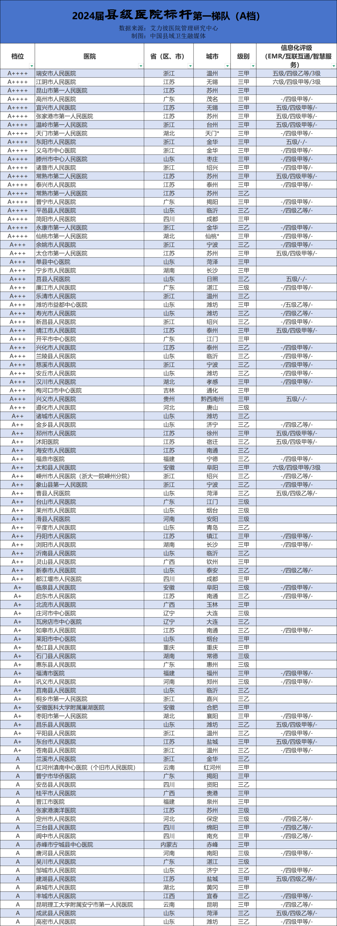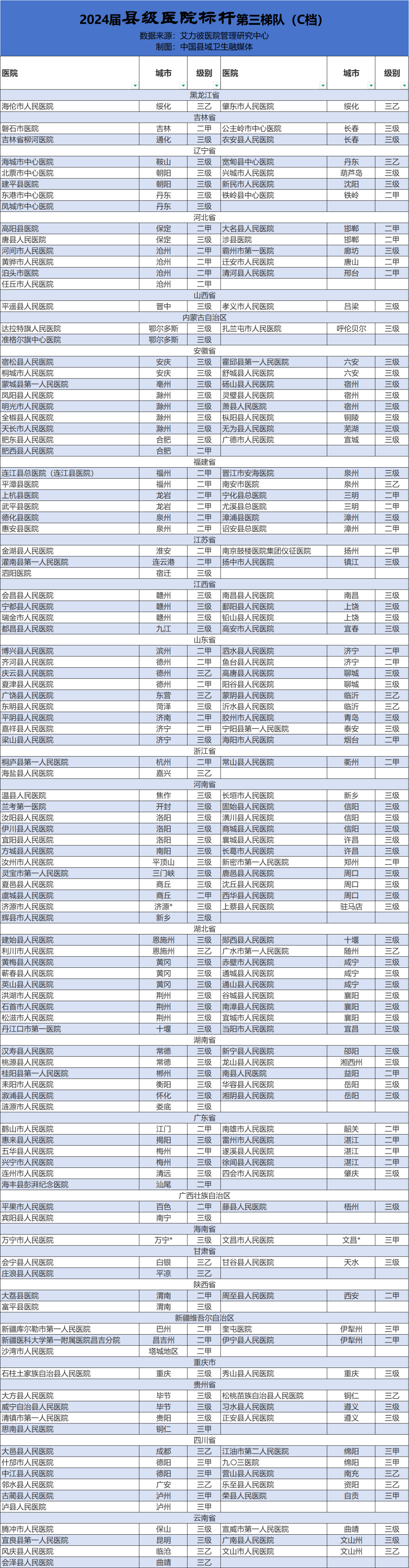 其中,县级医院标杆的评价对象是位于县域的综合医院,不含中医医院、专科医院和部队医院。以下是“2024届县级医院标杆”三个梯队全名单,快看看有你家医院吗?