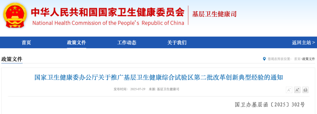 基层卫生健康综合试验区建设是深化医药卫生体制改革、推动基层卫生健康事业高质量发展的重要举措。自2021年启动建设以来,试验区所在省、自治区、直辖市高度重视、高位推动,积极支持试验区建设。12个试验区结合地方实际,坚持问题和结果导向,在重点领域和关键环节积极探索、攻坚克难,形成了一批可复制、可推广的改革创新经验。2024年,我委总结印发了首批改革创新典型经验,并以多种形式宣传推广,充分发挥了“试验田”的引领带动作用。