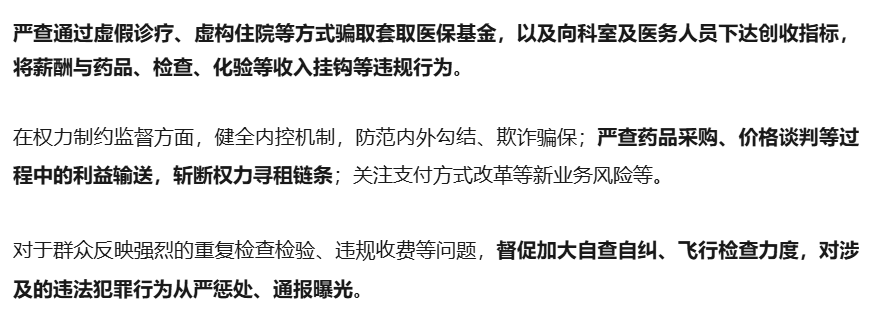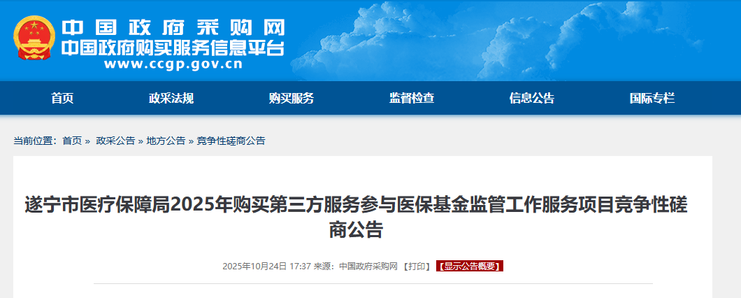 大批医院迎来严查👇 近日,中国政府采购网发布《遂宁市医疗保障局2025年购买第三方服务参与医保基金监管工作服务项目竞争性磋商公告》,计划开展新一轮医保基金飞检行动。 本轮行动中,遂宁市医保局为确保检查精准到位,共购买两个采购包。通过第三方技术团队,分2批对全市200家定点医疗机构、定点零售药店使用医保基金问题开展检查。其中: 船山区定点零售药店 50 家、诊所45 家、村卫生室5家共计100个服务点位。 安居区村卫生室1家,射洪市定点零售药店8家、村卫生室33 家,蓬溪县定点零售药店8家、村卫生室8家,大英县定点零售药店14 家、诊所25家、村卫生室3家共计100个服务点位。 通过2支第三方专业团队加入,该市在医药机构检查颗粒度上,明显进行了细化和升级。 一直以来,一些欺诈骗保行为可能已经成为某些机构的“潜规则”或生存手段。对此,遂宁市医保局本轮行动缩短检查周期,要求在合同签订后的30天内就完成核查,大幅挤压其违规的空间。 可以预见,本轮监管的“探头”和“牙齿”将异常锋利。该区域内大批医疗机构的,正处在一个被严密监控和高压治理的时期。 多省医保局出手! 年底前,全国大批医院迎来严查 今年以来,国家多次强调“严格医保基金监管”,全国各地医保部门的检查力度直增不减,将基金检查执行的颗粒度直接拉满。 11月3日,中国政府采购网发布《安康市医保局医保基金监管专项检查第三方信息服务采购中标(成交)》公告。要求开展周期不到2个月的监管行动。 公告指出,自合同签订之日起至2025年12月31日。由安康市医保局统一组织和分工,通过第三方配合开展不少于55家定点医药机构的现场检查工作。 10月27日,山西省医保局公布《医保基金监管第三方服务的采购公告》。该采购项目分为2包,通过招选第三方技术团队,分批对太原市定点医疗展开检查。 本轮检查组,医保局要求: 可见,当前针对医疗机构检查,不仅包含医保基金的使用合规,耗材进销管理等方面都被列入检查的重点。而在大数据+第三方机构的深度查账手段,严查手段还将进一步深入至医疗系统内的方方面面,任何违规行为都将无处可藏。 中纪委:紧盯关键部门、岗位, 大数据比对筛查,精准查找违纪违法问题 近日,中纪委发布题为《学纪知纪明纪守纪丨守好群众“看病钱”》,介绍医保监管聚焦的重点问题。 文中提到,要紧盯关键部门关键岗位,着力发现利用业务管理职权,以权谋私、收受贿赂,内外勾结欺诈骗保,以及不担当不作为乱作为,导致基金闲置浪费,甚至造成损失等问题。 智能化监管在文中被多次提到。 例如,调取医保基金支付情况、资金退回和追回情况、涉及医保基金领域的行政处罚案件台账等资料,对大数据进行分析比对,强化智能监督,着力查找违规违纪违法问题。 此外,推动医疗保障部门利用医保基金监管平台进行大数据比对,实现对诊疗行为、费用结算的全流程智能监控和风险实时预警,提升发现和打击欺诈骗保等行为的精准度和及时性。 11月6日,国家医保局发布《关于开展医保经办全流程智能审核试点工作的通知》,确定北京市、天津市、河北省、辽宁省、浙江省、湖南省、重庆市医疗保障局为试点单位,开展医保经办全业务流程智能审核试点工作。 国家医保局此前已启动了智能监管改革试点,共计覆盖全国92个地区、试点定点医药机构359家,试点内容包括“两库”建设、事前提醒、事中审核、事后监管等多个目标。 近段时间,大数据工作逐渐在医保监管的全链条实现应用。 河北在今年医保飞检提到,要强化数据筛查赋能,充分运用大数据筛查技术,靶向确定被检对象和疑点问题线索,提高飞行检查的精准度。 重庆大学附属三峡医院自主研发的数智监管平台,打通医疗、医药、医保、医采、医耗五大重点领域监管壁垒。从处方开立、药品使用、耗材采购到医保结算,实现全过程可溯、全环节可控。 从聚焦关键人物,到跨部门执法联动,再到智能工具赋能,医保监管的能效于近年全面跃升,医保违法违规行为将从源头上减少。