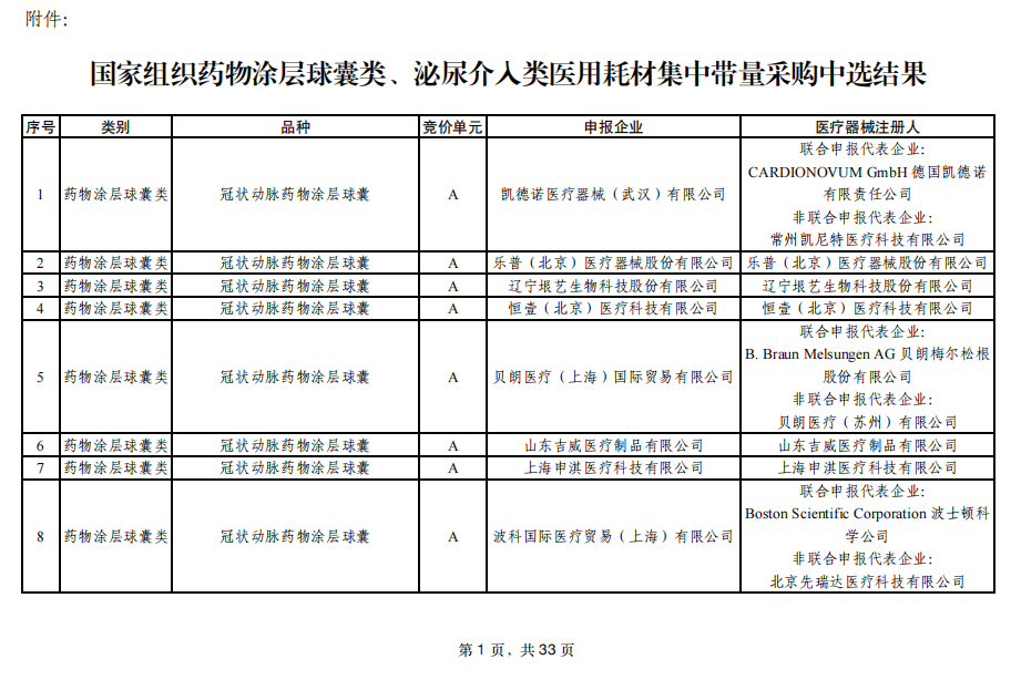 附件:国家组织药物涂层球囊类、泌尿介入类医用耗材集中带量采购中选结果