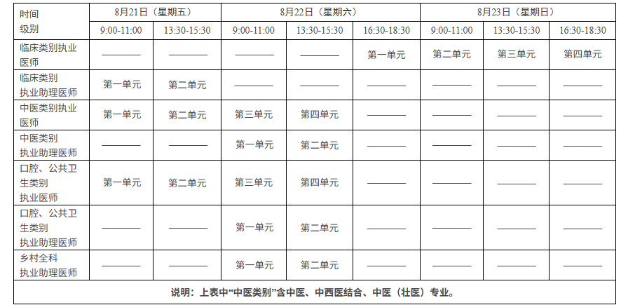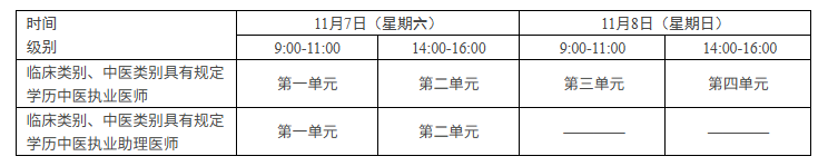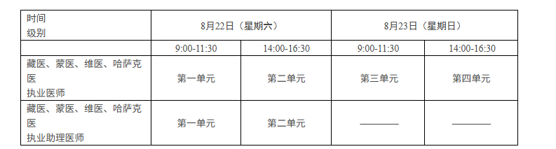 考试实行计算机化考试,军队现役人员、文职人员加试军事医学,院前急救岗位和儿科专业加试相应内容。中医类别藏医、蒙医、维医、哈萨克医专业实行纸笔考试。统一考试时间如下: