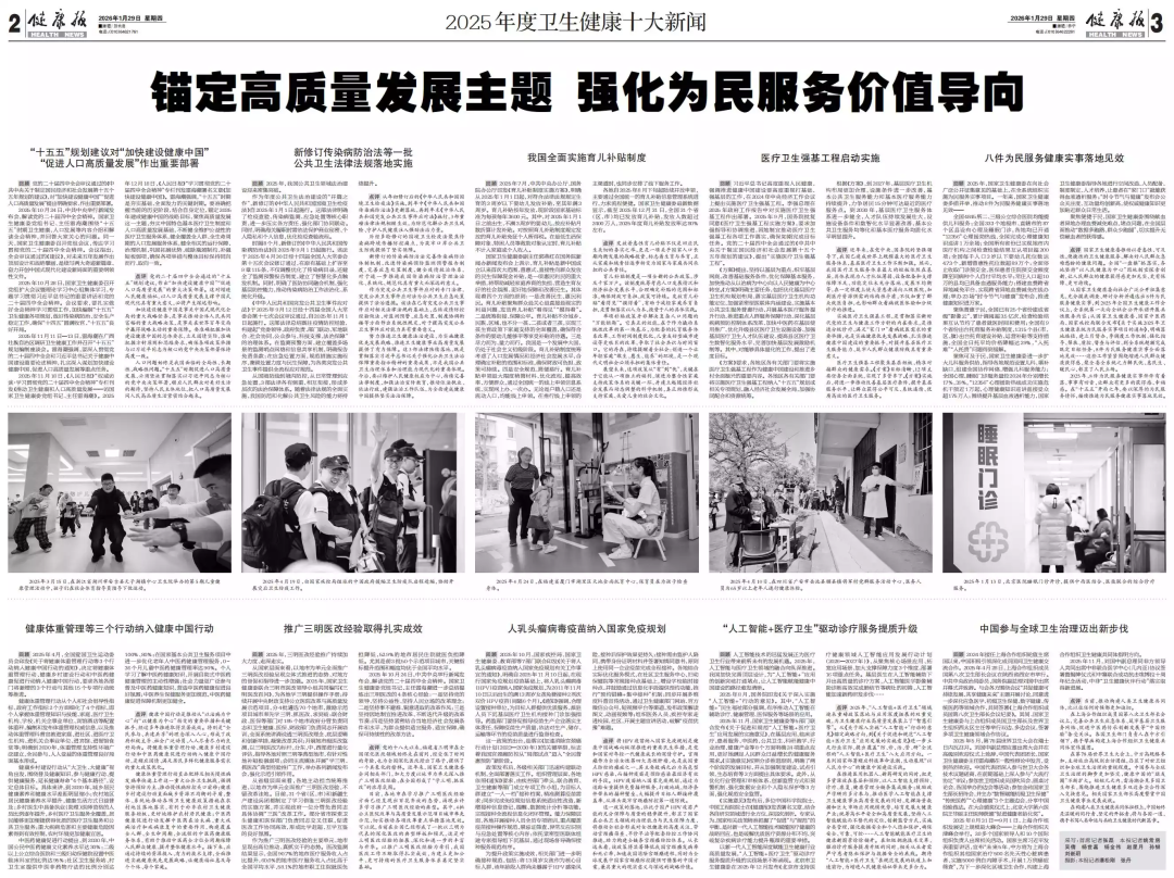 2025年,全国卫生健康系统践行“以人民健康为中心”,推动卫生健康和人口高质量发展取得显著成效。健康报社对过去一年与人民健康福祉紧密相连,且在行业内外引起广泛共鸣,对卫生健康事业高质量发展产生深远影响的新闻事件进行了全面回顾,在充分听取业界及专家意见建议的基础上,评选出年度卫生健康十大新闻。