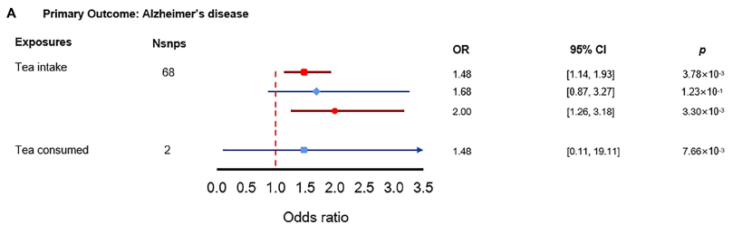 近日,中山大学附属第七医院的研究人员在" Frontiers in Nutrition "期刊上发表了一篇题为" Extra cup of tea intake associated with increased risk of Alzheimer’s disease:Genetic insights from Mendelian randomization "的孟德尔随机化研究论文。