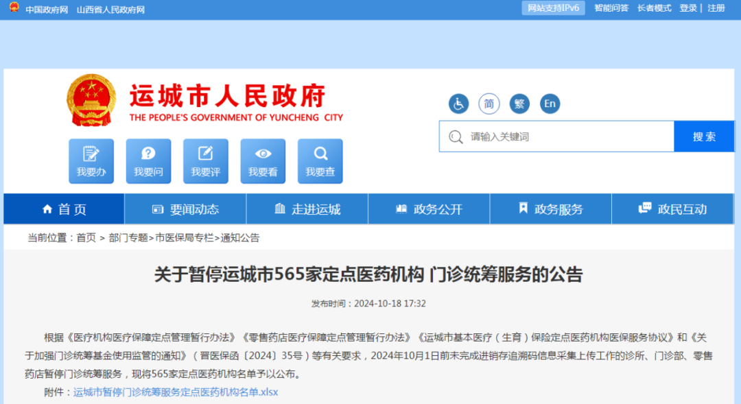 日前,山西运城市人民政府网站发布《关于暂停运城市565家定点医药机构门诊统筹服务的公告》,560余家定点医药机构由于未能及时完成进销存追溯码信息采集上传工作,而暂停门诊统筹服务,其中涉及零售药店380余家,占比约七成。