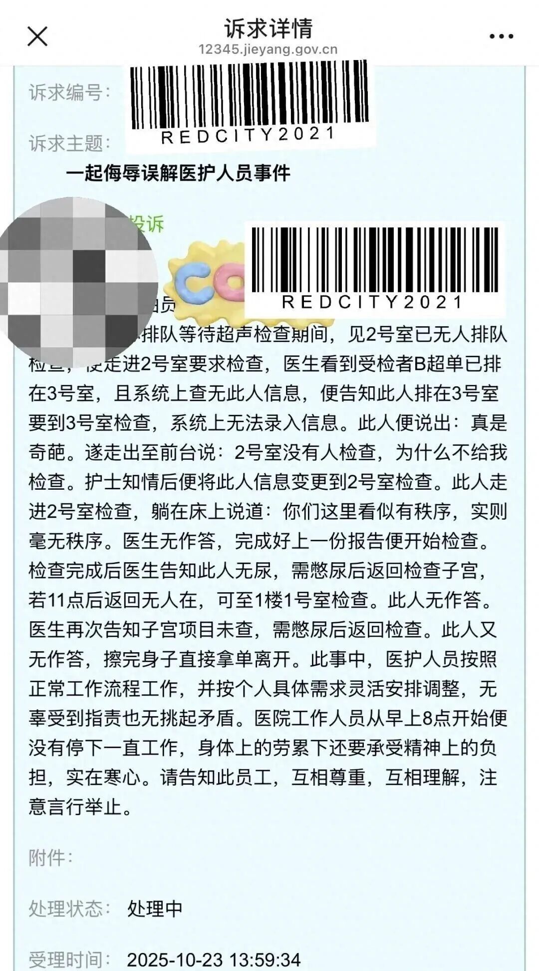 罕见!医生反向投诉患者获受理,涉事患者遭工作单位批评教育。 10 月 23 日,广东揭阳一名医生通过 12345 政府服务平台,发起了针对患者的反向投诉。诉求核心是患者无端侮辱、误解医护人员,该投诉不仅成功受理,还拿到了反馈结果。 涉事患者已因上述行为,被其工作单位批评教育。医生主动投诉患者且诉求落地、患者遭单位处理的情况,实属少见,相关事件也引发网友热议。 据悉,一名女性患者排队等待超声检查时,见 2 号室无排队人员,便径直进入要求检查。医生核对后发现,患者的 B 超单分配在 3 号室,系统中也无其在 2 号室的预约信息,遂告知需前往 3 号室检查,否则无法录入结果。 患者当场抱怨 “真是奇葩”,随后到前台投诉。护士了解情况后,为方便患者将其信息调整至 2 号室。检查期间,患者又吐槽 “看似有秩序,实则毫无秩序”,医生未予回应。检查结束后,医生两次告知患者因无尿,子宫项目未能完成,需憋尿后返回补查,若 11 点后返回可至 1 楼 1 号室办理,但患者始终未作答,擦身后方怒而离去。 整个过程中,医护人员既按正常流程开展工作,又根据患者需求灵活调整安排,即便无辜遭指责也克制情绪,未主动挑起矛盾。该医生表示,医院工作人员从早上 8 点起便持续工作,不仅身体劳累,还需承受精神压力,患者的侮辱行为令人寒心,希望双方能互相尊重、互相理解,注意言行举止。 11 月 2 日,该医生此前通过 12345 政府服务平台发起的反向投诉迎来处理结果。投诉受理后,12345 已通知涉事患者的工作单位,其单位第一时间对该员工进行了批评教育,这场医患小冲突也通过合理维权得以顺利化解。 医院领导对此次医生反向投诉的行为表示全力支持,认为这一维权机制未来会逐步完善。 涉事医生在得知处理结果后难掩欣慰:“真的特别开心,感觉生活还是充满光明的。特别感谢各位同行的支持,其实我们都不容易。比起工资,支撑我们坚持下去的更多是对患者的同理心,但我们的同理心也需要被回应。当患者缺乏对医护的理解,甚至无端指责侮辱时,忍不下去就无需再忍。希望每个坚守岗位的人都能被善待,这份职业初心永远不被磨灭。” 医生反向投诉患者,堪称医疗领域的新鲜事,在公开报道中更是首次出现。更值得关注的是,涉事医院领导明确支持这一反向投诉行为,认为相关维权机制未来会逐步完善,这也为破解医疗圈 “投诉必罚” 的困境,提供了全新思路。 这一事件引发了全国多地医生的共鸣与热议。云南一名体检中心医生分享了自身经历:“客户单位明确要求员工按预约时间体检,有位客户未预约却强行要求体检,遭拒后便投诉我们。我们直接反向投诉至其工作单位,最终对方单位要求他撤销了投诉。只要患者有工作单位,医生完全可以直接联系对方单位投诉,就看他是否在意。” 海南一名医生也讲述了类似经历:“曾有患者患冠脉肌桥,这是先天发育问题,商保无法报销。他一周内连续 4 次投诉我,声称我影响他报销,大概率是想逼我修改病历。前 3 次我都耐心解释,还提供了检查资料和疾病治疗指南,但对方仍不罢休。第 4 次投诉时,我不再解释,直接通过 12345 投诉他意图骗保,之后他就再也没投诉过了。” 还有医生直言:“都快 2026 年了,没必要被所谓的道德枷锁束缚。患者敢投诉,医生就敢反投诉,谁也不用怕谁。现在 12345 也开始受理医生的反向投诉了,毕竟 12345 受纪委监管,没理由只接收患者投诉,却无视医生的合理诉求。现在遇到患者威胁投诉,我会直接告诉他,我也是中华人民共和国公民,同样享有投诉权,若他严重妨碍我工作,我一定会投诉到底,完全不用妥协。” 笔者认为,权力与义务相辅相成,监督与被监督也应保持平衡,投诉权自然也该是双向的。当患者肆意滥用 “投诉权”,而医生连正当维权、表达不满的资格都没有时,这种失衡的局面迟早会被打破。 现实中,部分患者将 “投诉” 当作维权甚至牟利的工具。在他们认知里,医院怕影响形象、怕舆情扩大,只要闹一闹,就可能 “讹到钱”。而不少医院为了息事宁人,往往选择向患者妥协,对涉事医生、科室进行严厉处理,即便医生并无过错。 2023 年《中国医师执业状况白皮书》的数据更能反映问题:76.3% 的医生近 3 年遭遇过投诉,其中 42.1% 的投诉最终被认定为 “无医疗过错”。更有 80% 的受访者认为,医疗机构对投诉的处置并不合理。医生的不满主要集中在三点:一是医疗投诉的真实性、合理性缺乏明确界定标准;二是医疗投诉不应与医生绩效、工资直接挂钩;三是明明是无效投诉,为何还要让医生 “背黑锅”。 说到底,面对医疗投诉,患者有不满,医生的委屈与不满,其实更值得被看见、被正视。 按照医疗投诉的定义,其核心是患者及家属等相关人员,针对医院的医疗服务、护理质量或环境设施等存在异议,且在医务人员存在过错的前提下,通过来信、来电、来访等方式向官方平台或医院直接反映问题、提出诉求。 但如今,部分医疗投诉呈现泛滥态势,一些芝麻大的小事,即便医务人员完全按规章制度办事,也可能遭到患者投诉。 比如 10 月 30 日,大庆市民陈先生在《党风政风行风热线》节目中,就投诉了当地中医院取药不提供塑料袋的问题。陈先生表示,自己患有多种慢性病,需到多个科室分别挂号开药,药品数量较多,医院不提供塑料袋的做法,给其就医带来了极大不便。 大庆市中医院回应,