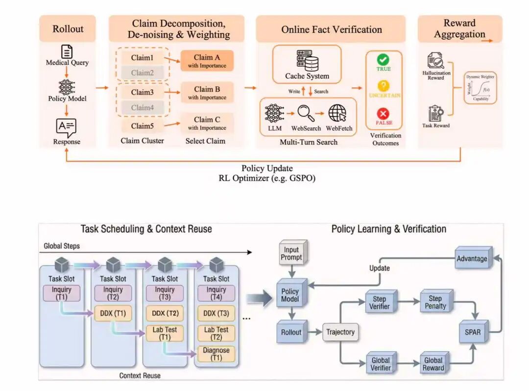 百川的Baichuan-M3,在架构上设计了病史采集、鉴别诊断、检验检查、精确诊断四个模块,整体导向诊断准确性的训练目标,并叠加了一道事实后验降低幻觉率。