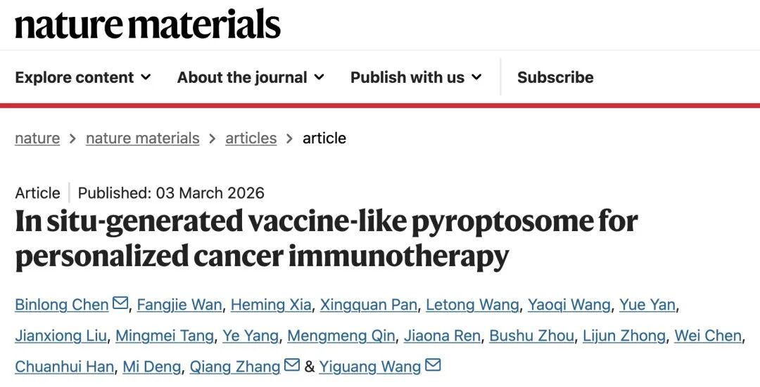 2026 年 3 月 3 日,北京大学药学院汪贻广教授、张强院士和陈斌龙副研究员作为共同通讯作者(陈斌龙、万方劼为论文共同第一作者),在 Nature 子刊 Nature Materials 上发表了题为:In situ-generated vaccine-like pyroptosome for personalized cancer immunotherapy 的研究论文。