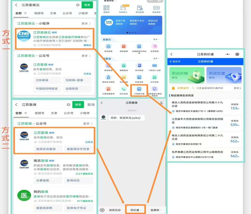 在微信搜索“江苏医保云”或关注“江苏医保”微信公众号,点击“江苏药价通”进入查询界面。