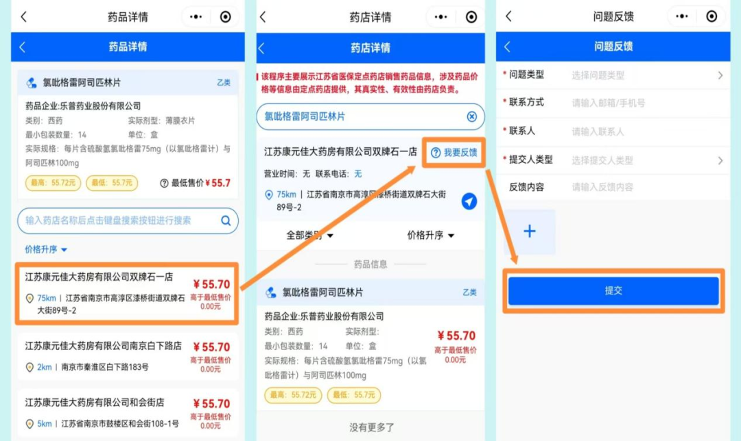 “问题反馈”功能是“江苏药价通”一大亮点。群众可通过该功能反映在购药时遇到现场售价与系统查询价格不符、查询到的在售药品现场无货、药店位置信息不准确等问题,让医保定点药店接受群众监督;医保定点药店也可通过该功能及时反馈意见建议。医保部门将动态关注反馈问题,及时予以处理解决,提升“江苏药价通”信息的真实性、准确性。