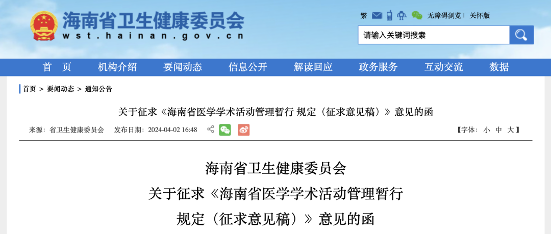 2024年4月2日,海南省卫健委就《海南省医学学术活动管理暂行规定(征求意见稿)》发函。