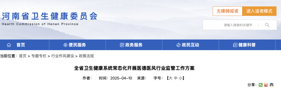 2025年4月10日,河南发布《全省卫生健康系统常态化开展医德医风行业监管工作方案》。