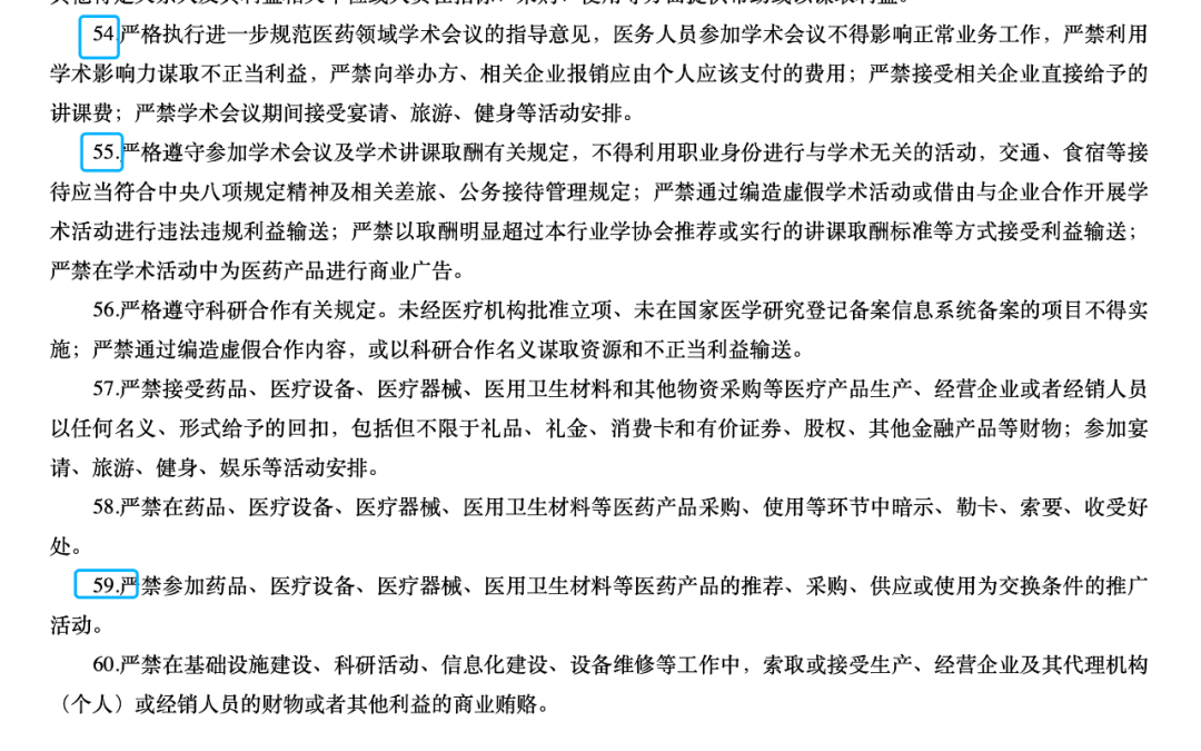 其中提到,重点监管医务人员参与或接受影响医院采购工作或医疗行为公正性的宴请、旅游、学习、考察或其他休闲社交活动;参加以某医药产品的推荐、采购、供应或使用为条件的推广活动。