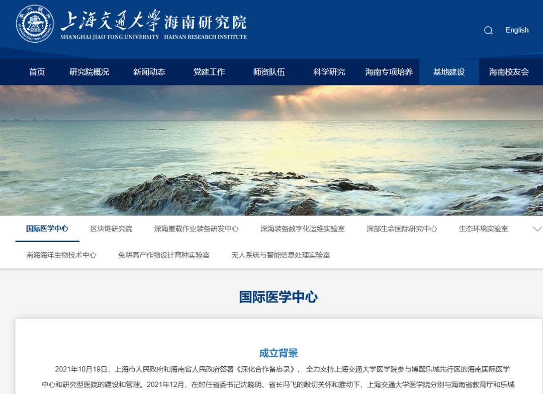 “上海交通大学海南研究院”官方消息介绍,2021年10月,上海市人民政府和海南省人民政府签署《深化合作备忘录》,全力支持上海交通大学医学院参与博鳌乐城先行区的海南国际医学中心和研究型医院的建设和管理。