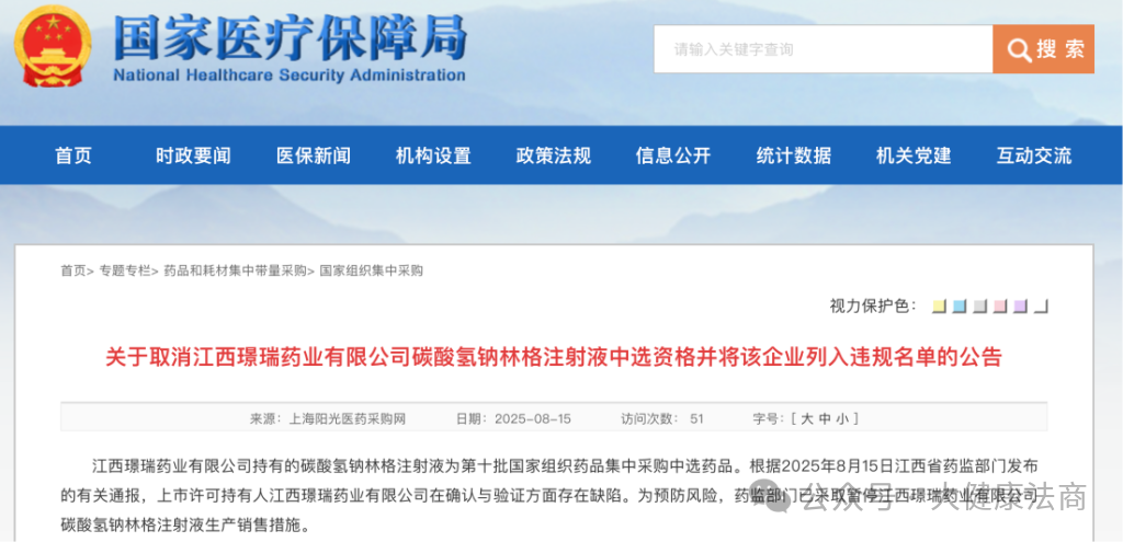 江西璟瑞药业因质量问题被取消集采中选资格 8月15日,国家组织药品联合采购办公室发布公告,取消江西璟瑞药业有限公司碳酸氢钠林格注射液的中选资格,并将该企业列入“违规名单”,暂停该企业自2025年8月15日至2027年2月14日参与国家组织药品集中采购活动的申报资格。 8月15日,国家组织药品联合采购办公室发布公告。 据了解,江西璟瑞药业有限公司持有的碳酸氢钠林格注射液为第十批国家组织药品集中采购中选药品。江西省药监部门发布的有关通报信息显示,上市许可持有人江西璟瑞药业有限公司在确认与验证方面存在缺陷。为预防风险,药监部门已采取暂停该公司碳酸氢钠林格注射液生产销售措施。 “此次事件对企业将产生多方面的打击。”8月16日,上海市卫生和健康发展研究中心主任金春林告诉人民日报健康客户端记者,被取消中选资格且近两年无法参与国家组织药品集中采购申报,意味着企业将失去重要的销售渠道,市场份额面临流失,营收可能大幅下降。而在后续整改中也会需要大量的时间和成本。 北京中医药大学卫生健康法学教授邓勇表示,被列入“违规名单”会严重损害企业声誉,导致合作伙伴和投资者信心受挫,不仅后续的合作与融资难度加大,其他产品的销售推广也会受到阻碍。企业在整改中可能涉及的设备改造、完善注册等工作,无疑会增加企业的经济负担,而整改若不达标,恢复生产销售和参与集采申报将更加困难。 该举措是否会对百姓日常用药有所影响?邓勇介绍,在药品供应方面,若江西璟瑞药业是当地该药品的主供企业,短期内药品供应可能出现波动。不过按照规定,相关省份会启动替补程序,由备供企业替补成为主供企业并按中选价格供应,能保障基本供应。但新主供企业在初期产能爬坡阶段,部分地区可能会出现短暂的缺货情况。 在用药安全上,药监部门及时暂停问题药品的生产销售,有效降低了患者使用风险,且后续监管力度会进一步加强,以确保公众用药安全。在药品价格方面,替补企业按中选价供应,理论上价格能够保持稳定,但从长期来看,若药企整改投入增加、市场供需关系发生变化,药品价格或许会出现一定波动。 “药品集采不能只追求低价,更要坚持质量优先。”金春林表示,这一事件也让老百姓更加理解和支持集采政策的完善,特别是第十一批集采政策中体现出的质量优先原则,有助于推动医药行业在保证质量前提下实现健康发展,切实保障公众用药安全与权益。 原文来源于人民日报健康客户端 2025年8月17日