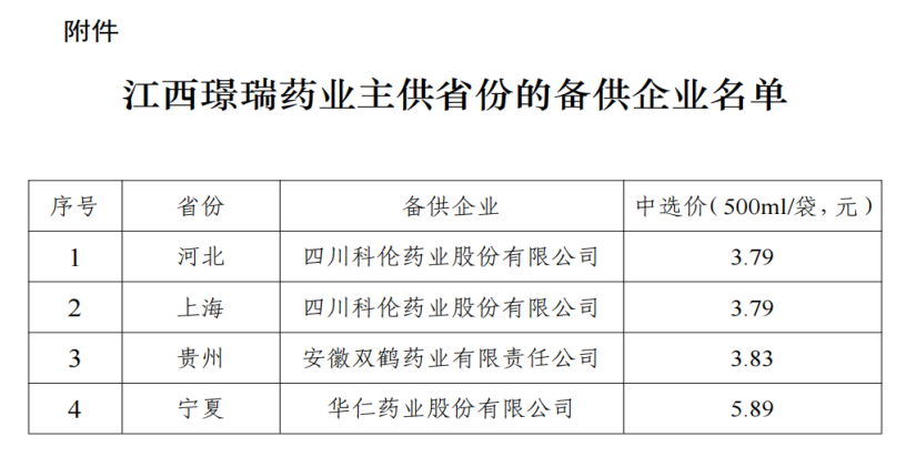 公告显示,江西璟瑞药业主供省份有河北、上海、贵州、宁夏。按照替补规则,河北、上海两地由科伦药业接替供应,贵州、宁夏分别由安徽双鹤药业、华仁药业接替供应。