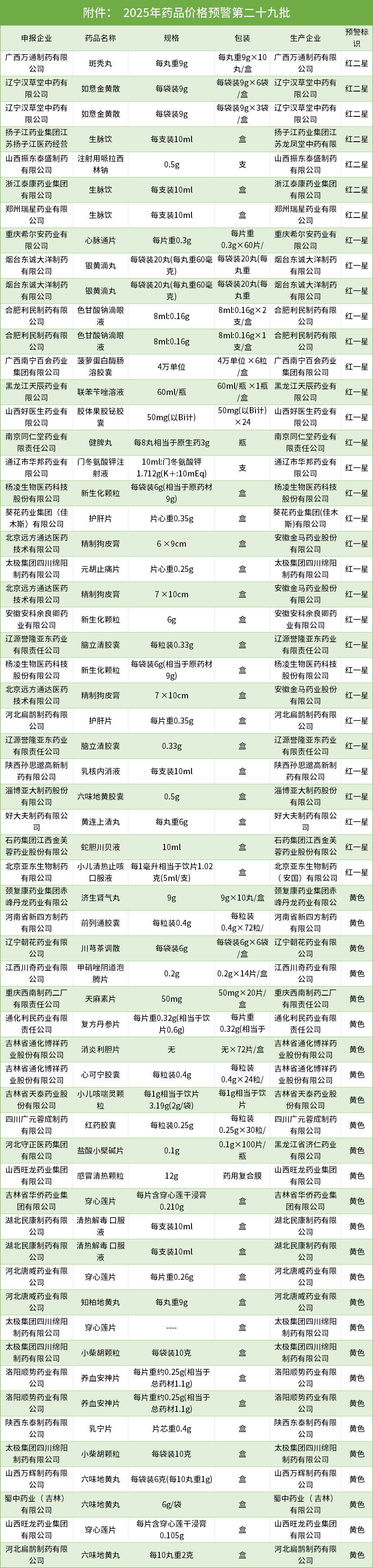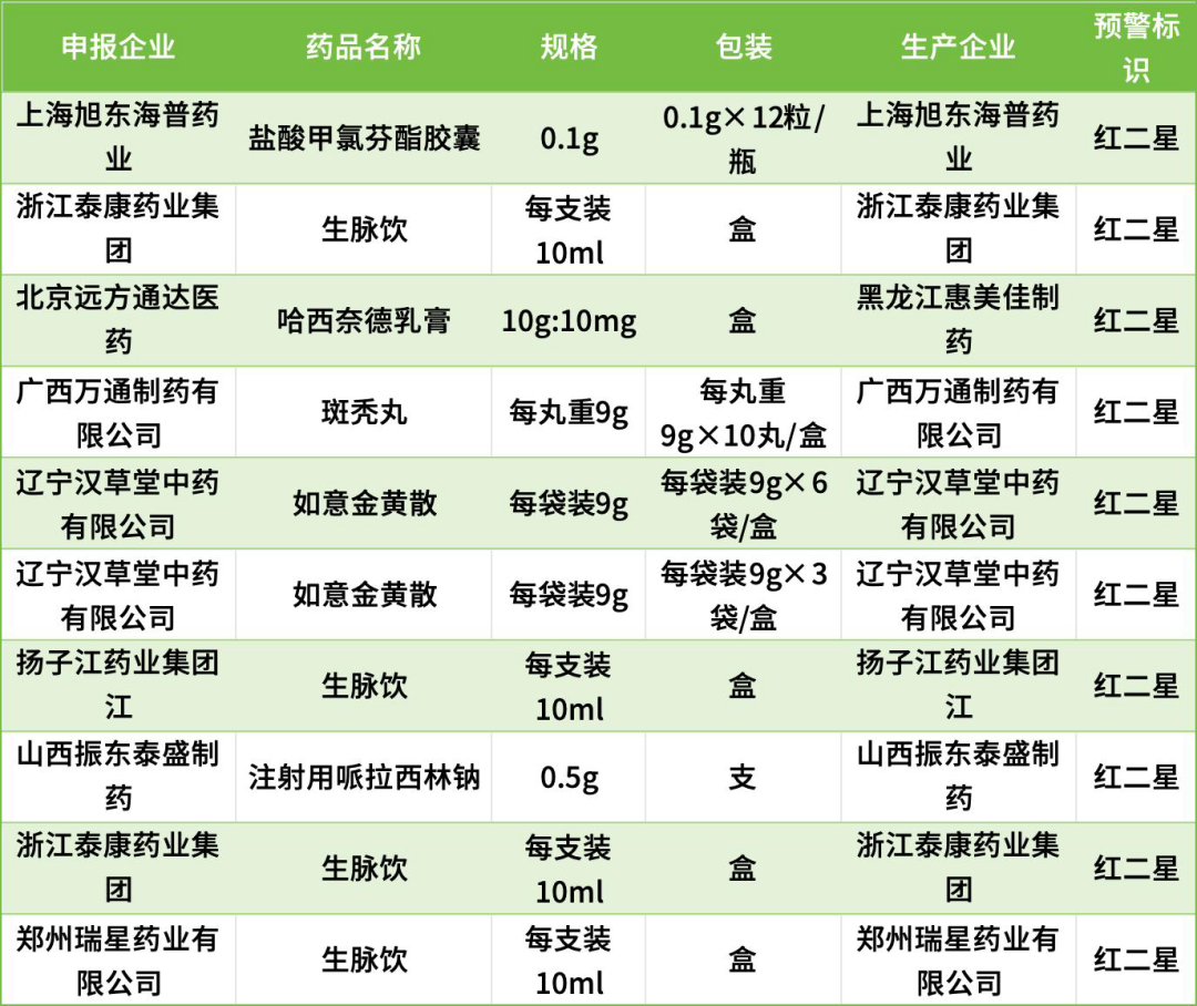 触发红二星预警的10个药品中,7个为中成药,包括生脉饮等知名品种。触发红一星预警的38个药品中有26个为中成药,占比达到近68%。其中包含六味地黄胶囊、清热解毒颗粒、健脾丸、新生化颗粒、心脉通片、银黄滴丸、护肝片、精制狗皮膏、元胡止痛片、脑立清胶囊、乳核内消液、黄连上清丸、蛇胆川贝液、小儿清热止咳口服液14个品种。而黄色预警药品中,中成药占比更是高达88%,68个药品中有60个为中成药。