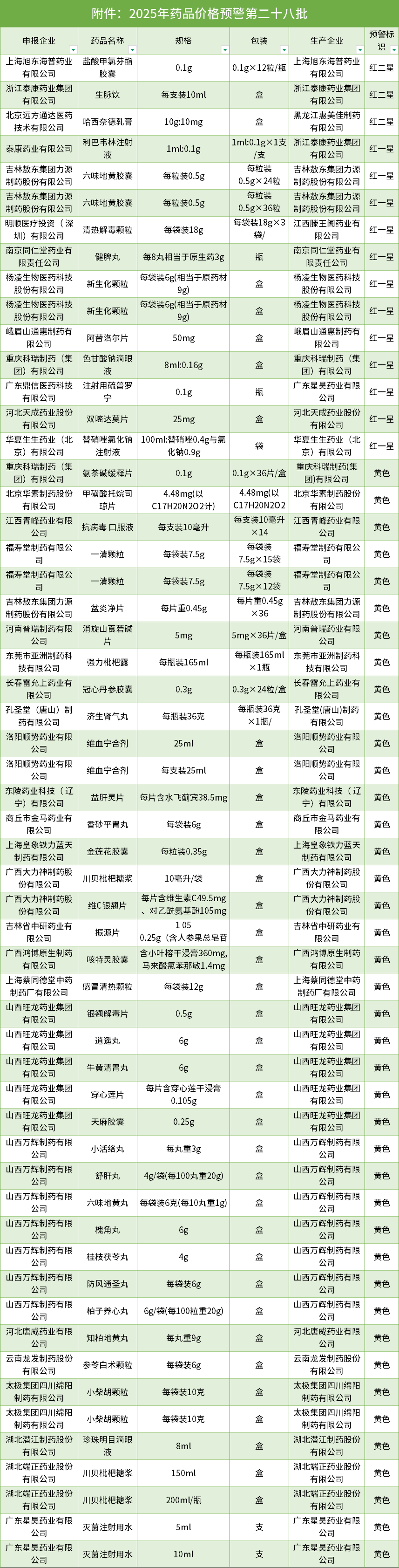 根据预警规则:价格高于已挂网最高价5倍(含)-10倍的标记为红二星预警;价格高于已挂网最高价2倍(含)-5倍的标记为红一星预警;价格高于已挂网最高价但不足2倍的标记为黄色预警。对红二星、红一星预警药品,医保部门将约谈相关企业,并提醒医疗机构谨慎采购;对黄色预警药品,仅提醒医疗机构。
