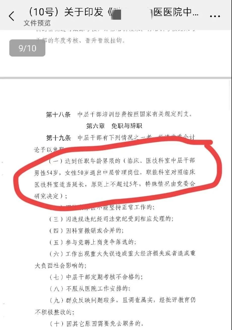 其中第十九条表示,中层干部有下列情况之一,予以免职,第一项就是有关年龄的规定,内容为:达到任职年龄界限的(临床、医技科室中层干部男性54岁,女性50岁,退出中层管理岗位,职能科室对照临床医技科室适当延长,原则上不超过5年,特殊情况由党委会研究决定)。