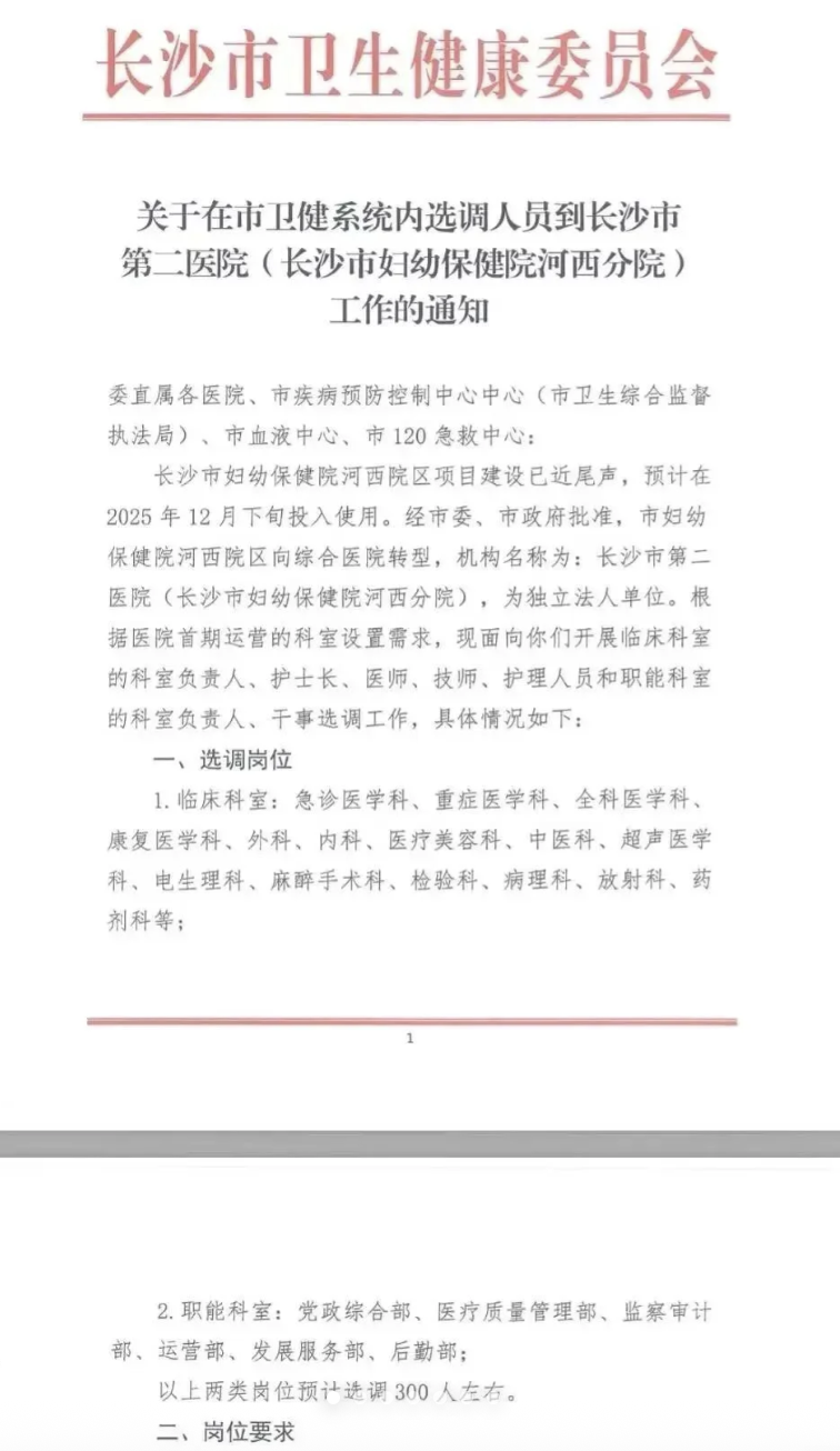 近日,长沙市卫生健康委员会印发《关于在市卫健系统内选调人员到长沙市第二医院(长沙市妇幼保健院河西分院)工作的通知》,通知显示,长沙市妇幼保健院河西院区项目建设已近尾声,预计在2025年12月下旬投入使用。经市委、市政府批准,市妇幼保健院河西院区向综合医院转型,机构名称为长沙市第二医院(长沙市妇幼保健院河西院区),为独立法人单位。 几年前以妇幼保健院的名称开始建设的医院项目,如今即将开业,名称也将迎来调整。 根据医院首期运营的科室设置需求,向委直属医院、市疾控中心、市血液中心、市120急救中心开展临床科室负责人、医生护士等人员干事的选调工作,选调临床科室和职能科室两类岗位预计300人左右。 据三湘都市报消息,长沙市妇幼保健院河西分院于2022年4月开工,建设项目总投资16.3亿元,是“健康长沙”建设PPP项目启动的首个市本级新建项目,也是国家PPP库中医疗卫生领域总投资额最大的项目。该项目由长沙市医健建设发展有限公司建设。 医院项目规划共分两期建设。一期规划总建筑面积约为 19万平方米,设计总床位数为1300张,原本计划建成一所集预防、保健、医疗、康复、科研和教学为一体的三级甲等妇幼保健院(专科医院),着力打造国内一流的现代化三级甲等妇幼保健专科医院,同时挂牌长沙市儿童医院。 (项目效果图) 由于之前官宣资料称医院将于2025年6月底开业运营,今年8月份医院仍未如期开业,有网友在问政平台咨询长沙市妇幼河西新院开业时间,8月6日,长沙湘江新区卫生健康局回复表示,目前长沙市妇幼保健院(河西新院)项目主体已完成施工,正在进行机电安装、室内精装修、医疗专项,室外园林等工程施工,大型医疗设备正逐步进场,正在积极筹备开院运营的前期准备工作,预计2025年底完成验收投入使用。” 8月25日,长沙市卫生健康委员会官网发布了《长沙市医疗机构设置规划(2025—2030年)》的公示。一批医院新建/扩建计划引发关注。其中就有长沙市第二医院(暂命名)在列,公示的位置选址就是此前长沙市妇幼保健院河西分院的位置。 如今,随着向全市选调临床及行政科室医务人员的通知印发,长沙市妇幼保健院河西分院成为第二名称,年底开业的医院将以长沙市第二医院正式运营。