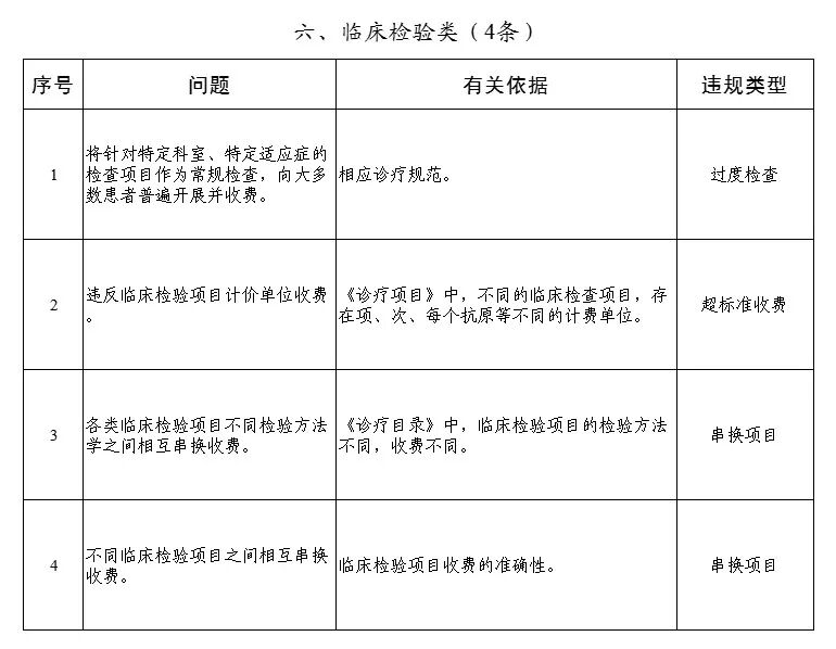 7月12日,国家医保局发布《飞检进行中,我们正在严查这些行为!》,并且公开发布了《定点医疗机构违法违规使用医疗保障基金典型问题清单》(2024版)。 《典型问题清单》共包括心血管内科、骨科、血液净化、康复、医学影像、临床检验六大类,其中临床检验类的典型问题共有4条,涉及3种违规类型: 这里检验君整理了实际操作中各地医保违规清单中这4条违规类型的典型案例: 降钙素原、B型钠尿肽(BNP)、肌钙蛋白Ⅰ等检验项目列入常规入院检查套餐项目。 血气分析套餐式收取血糖、血红蛋白、钾钠氯钙离子、全血乳酸测定、渗透压检查、血清碳酸氢盐测定、血清葡萄糖测定、红细胞比积测定等的费用。 将血淀粉酶测定、脂肪酶测定作为入院常规检查项目。 心肌酶打包检测超敏C反应蛋白、血清肌钙蛋白T测定、血清肌红蛋白测定。 血细胞分析检查,常规将降钙素原(PCT)检测(限重度感染)无指征打包检查。 便常规打包:隐血试验(包括粪便、呕吐物、痰液、分泌物、脑脊)检查;寄生虫镜检。 尿常规检查同时打包尿比重测定、尿常规检查、尿蛋白定性、尿三胆检查、尿酸碱度测定等项目。 肾功能检查,常规将血清胱抑素(Cystatinc)测定、肌酐测定无指征打包。 血细胞分析检查,常规将C-反应蛋白测定或和超敏C反应蛋白测定无指征打包检查。 血常规打包收费血常规分项、嗜碱性粒细胞计数、异常白细胞计数、异常白细胞形态检查、嗜酸性粒细胞直接计数、有核红细胞计数。 凝血功能检查打包白陶土部分凝血活酶时间测定、活化部分凝血活酶时间测定、D-二聚体测定。 血型鉴定打包 ABO 红细胞定型、ABO 血型鉴定、ABO 亚型鉴定、 Rh 血型鉴定、 Rh 血型其他抗原鉴定、特殊血型抗原鉴定、血型单特异性抗体鉴定等项目。 葡萄糖测定打包血清果糖胺测定。 乙肝两对半打包乙型肝炎 DNA 测定。 尿液分析(干化学法)、尿常规检查与尿沉渣镜检打包检查。 阴道分泌物检查打包收取特殊细菌涂片检查、 一般细菌涂片检查、真菌涂片检查。 无前列腺疾病指征前提下,普遍开展总前列腺特异性抗原测定、游离前列腺特异性抗原测定检查。 对无糖尿病等基础疾病患者开展糖化血红蛋白普遍检查。 入院常规套餐式检查男/女性肿瘤标志物。 无甲状腺疾病相关指征,普遍开展抗甲状腺球蛋白抗体测定(TGAb)、抗甲状腺过氧化物酶抗体(TPO)检查。 非手术病人常规筛查感染八项。 常规药敏定性试验+常规药敏定量试验(MIC)打包收费。 超适应症检查不加热血清反应素试验项目。 将血型单特异性抗体鉴定作为血型的常规检验项目。 将糖化血红蛋白测定作为常规检验项目。 将血清亮氨酰氨基肽酶测定、血清α-L-岩藻糖苷酶测定作为肝功能的常规检验项目。 将血浆D-二聚体测定(D-Dimer)作为凝血功能的常规检验项目。 同日内收取1次以上的血栓弹力试验(TEG),涉嫌过度检查。 降钙素原检测单日检查数量超过1次,涉嫌过度检查。 红细胞比积测定(HCT)每日使用收费大于1,涉嫌过度检查。 粪便、呕吐物、痰液、分泌物、脑脊液、胸腹水等的隐血试验每项检查计价超过1次,涉嫌过度检查。 住院期间同一患者多次开展梅毒螺旋体特异抗体测定(凝集法等)的情形。 《诊疗目录》中,血栓弹力图试验(TEG)项目计价单位:按“项”收费。某医院开展血栓弹力图试验(TEG)检查,按检查使用的试剂杯数收费,属于超标准收费。 检验科加收费用,如检验科的部分项目规定,化学发光法可以加收,医院收取了该费用,但并非用的是化学发光法试剂。 21年血气分析同时进行无机元素测定的,无机元素测定收取全费。根据当时《陕西省医疗服务项目价格》规定:血气分析同时进行无机元素测定的,无机元素按70%收费。 检验项目未按规定减收,如22年“乙型流感病毒抗原检测”与“甲型流感病毒抗原检测”同时检测时,“乙型流感病毒抗原检测”按照全价收取费用。但按照《陕西省医疗服务项目价格》,“乙型流感病毒抗原检测”与甲流同时检测时按60%收费。 “C-反应蛋白测定(CRP)(免疫比浊法)”串换为“C-反应蛋白测定(CRP)(散射速率法)”收费 超敏C反应蛋白测定免疫比浊法、干式免疫荧光法,串换成金标法。 医院在进行尿蛋白测定时使用的试剂为“尿/脑脊髓总蛋白(TPUC)测定试剂盒(邻苯三酚红钼法)”,按试剂标识的化验方法开展尿蛋白定量应按尿蛋白定量(化学法)收费,实际按尿蛋白定量(免疫比浊法)。 粪便隐血试验(OB)化学法”"粪便隐血试验(OB)免疫法”,串换为"粪便隐血试验(OB)单克隆金标法”进行收费 医院开展25羟维生素D测定(色谱法)实际方法为化学发光法,但收取色谱法费用。 医院开展“β2微球蛋白测定(免疫比浊法)”串换成“β2微球蛋白测定(化学发光法)”。 医院开展“尿素测定(干化学法)时,实际开展的项目是“尿素测定(酶促动力学法)”。 医院收取“肺炎支原体血清学试验(荧光探针法)”费用,实际使用试剂为肺炎支原体血清学试验(化学发光法)。 离子选择电极法串换为干化学法收费 检验试剂为检测"全血细胞计数+3分类"却收取了"全血细胞计数+5分类"项目费用 淋巴细胞免疫分析将“T淋巴细胞转化试验(T淋巴细胞亚群检测及计数)”串换为“淋巴细胞免疫分析” 将自费项目(全自动快速细菌培养及鉴定加收)串换为一般细菌培养及鉴定 将目录外项目“二氧化碳结合力”串换为目录