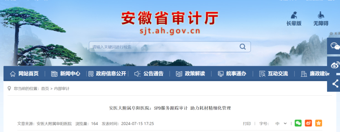 7月15日,安徽省审计厅发布了一则信息,《安医大附属阜阳医院:SPD服务跟踪审计 助力耗材精细化管理》。